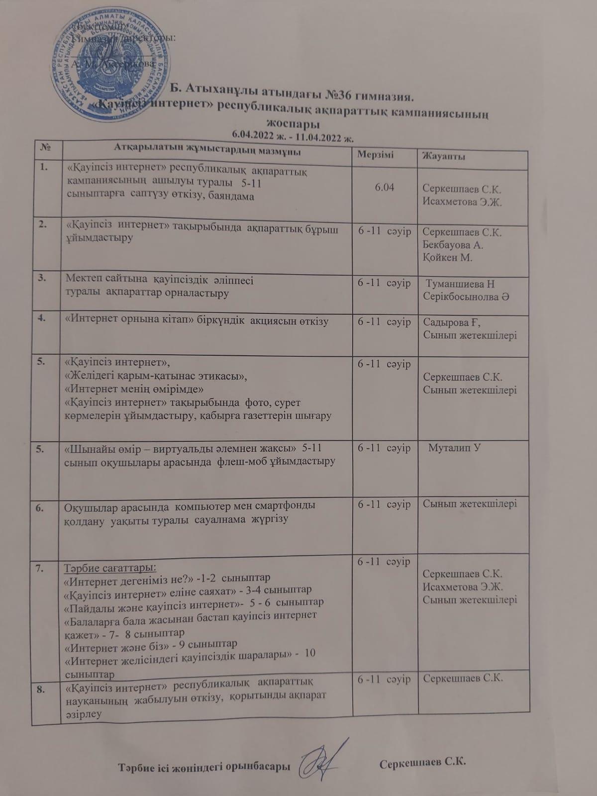 Оқушының санасын улайтын түрлі қауіпті сайттардан қорғау мақсатында №36 Б.Атыханұлы   атындағы гимназиямызда «Қауіпсіз интернет» атты ақпараттық науқаны ашылып, іс-шаралары 6-11 сәуір аралығында жоспарланды. Науқан барысында мектебімізде «Қауіпсіз интернет» республикалық  ақпараттық кампаниясының  ашылуы туралы   5-11 сыныптарға  саптүзу өткізілді, баяндамалар оқылды.«Қауіпсіз  интернет» тақырыбында  ақпараттық бұрыш ұйымдастырылып таныстырылды. Оқушылар арасында  компьютер мен смартфонды қолдану  уақыты туралы  сауалнамалар жүргізілді. «Шынайы өмір – виртуальды әлемнен жақсы»  5-11 сынып оқушылары арасында  флеш-моб ұйымдастыру Әр сыныптарда сынып сағатында  «Интернет дегеніміз не?» -1-2  сыныптар, «Қауіпсіз интернет» еліне саяхат» - 3-4 сыныптар,  «Пайдалы және қауіпсіз интернет»-  5 - 6  сыныптар, «Балаларға бала жасынан бастап қауіпсіз интернет қажет» - 7-  8 сыныптар, «Интернет және біз» - 9 сыныптар, «Интернет желісіндегі қауіпсіздік шаралары» -  10 сыныптарда өткізілді.