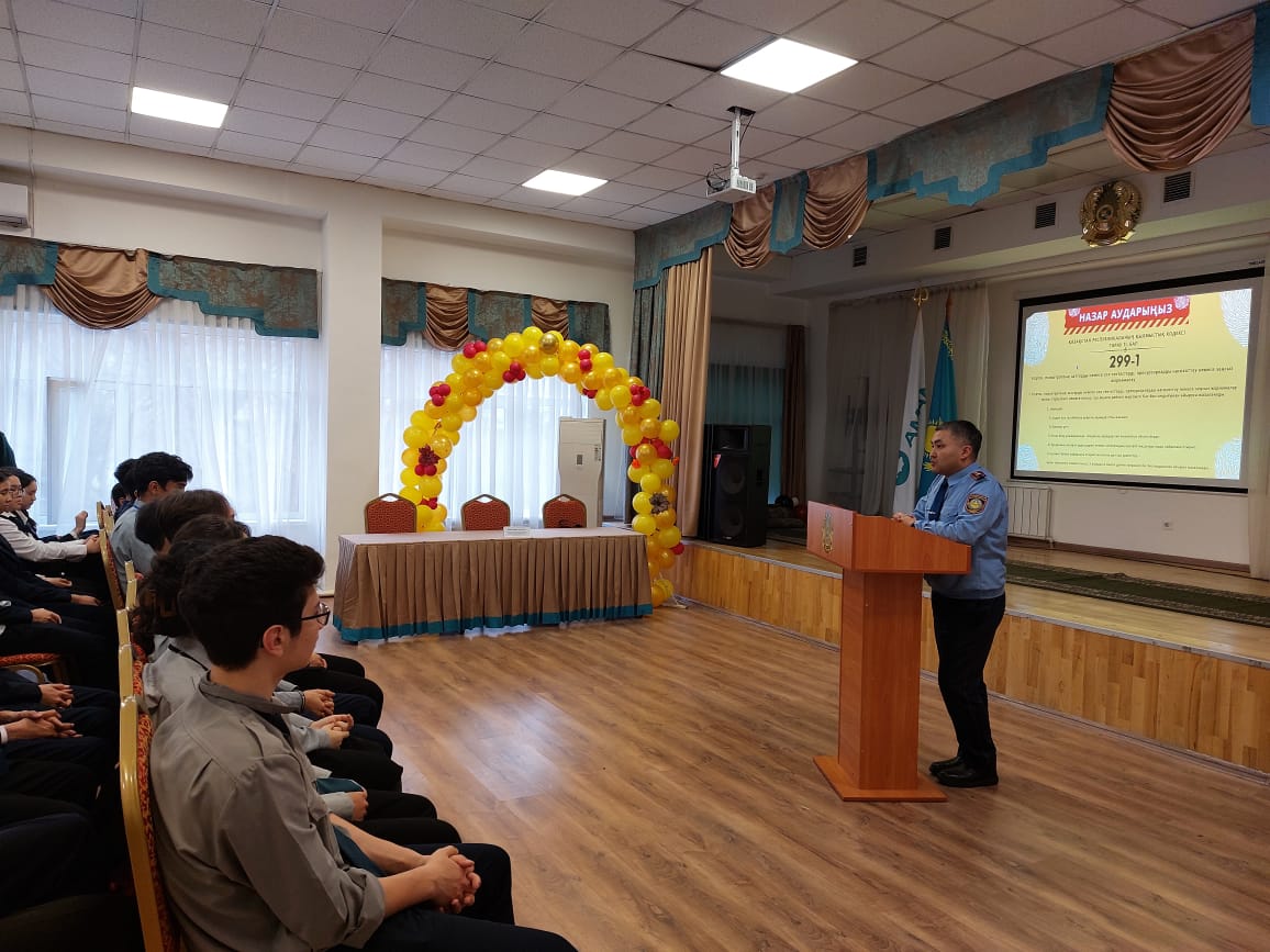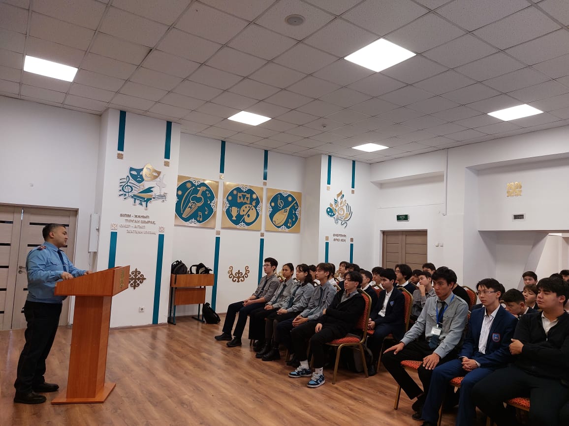 07.12.2023ж. Б.Атыханұлы атындағы №36 гимназияда Алматы қаласы полиция департаменті есірткі қылмысына қарсы іс-қимыл басқармасының аға жедел уәкілі полиция майоры Көбеев Дәурен Асқарұлы мен қалалық наркологиялық орталық маманы Психиатр- нарколог дәрігер Трубникова Анна Александровна жоғарғы сынып оқушыларымен "Нашақорлық- болашағына жасалған қылмыс" тақырыбында дәріс жүргізді. Мақсаты: Өскелең ұрпағымызды салауатты өмір салтын сақтап, жат қылықтардан, нашақорлықтан бойын аулақ ұстауға тәрбиелеу.