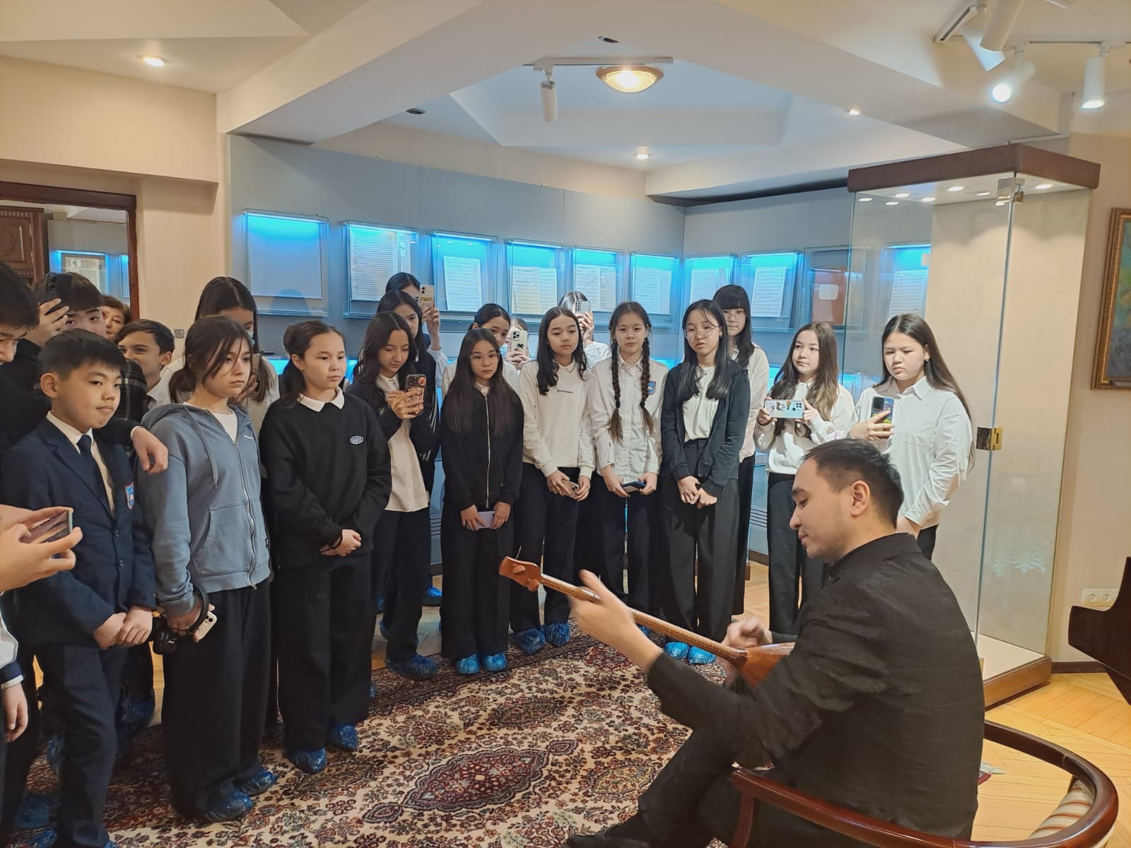 Бүгін 36гимназия оқушылары Мемориалды мұражайда Н.Тілендиевтің жеке өмірі мен шығармашылығынан сыр шертетін,бағы мен байлығына айналған музыкалық аспаптары,әуезді әндері мен күмбірлеген күйлерінің қолжазбаларының түп нұсқасымен,кітаптары,фотосуреттері,