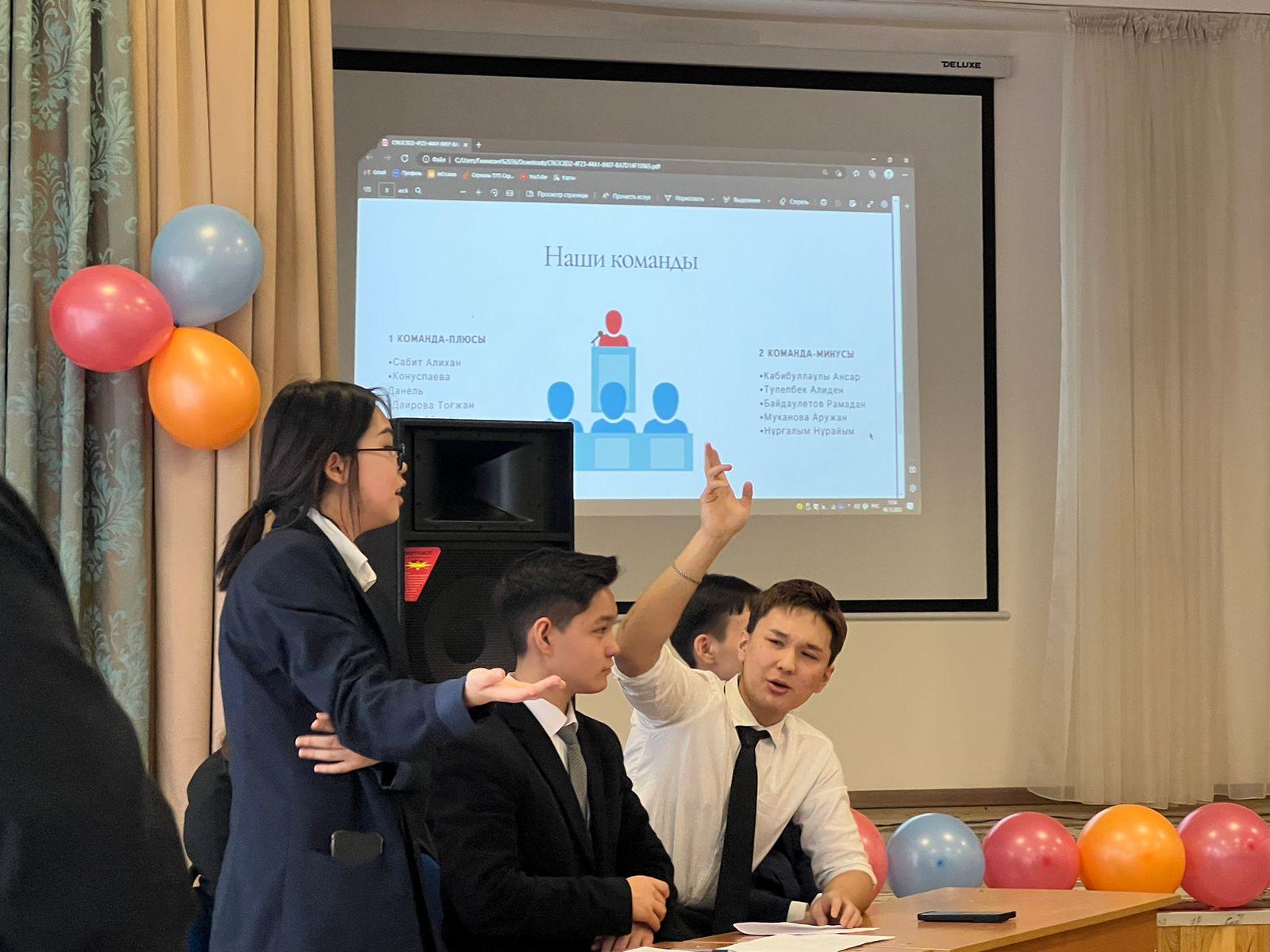 2022жылдың 6 желтоқсанында 9-10 сыныптар арасында “Плюсы и минусы триединства языков» тақырыбында дебат өтті. Жетекшісі: Мұхтаржанқызы Ляззат. Мақсаты: оқушылардың ой-өрісін кеңейту, сенімділіктерін арттыру, ой алмасу, тіл байлықтарын жетілдіру. Дебат өте тартысты және қызықты болып өтті. Оқушылар өз мүмкіндіктерін пайдаланып, жаңа қырларынан танылды.
