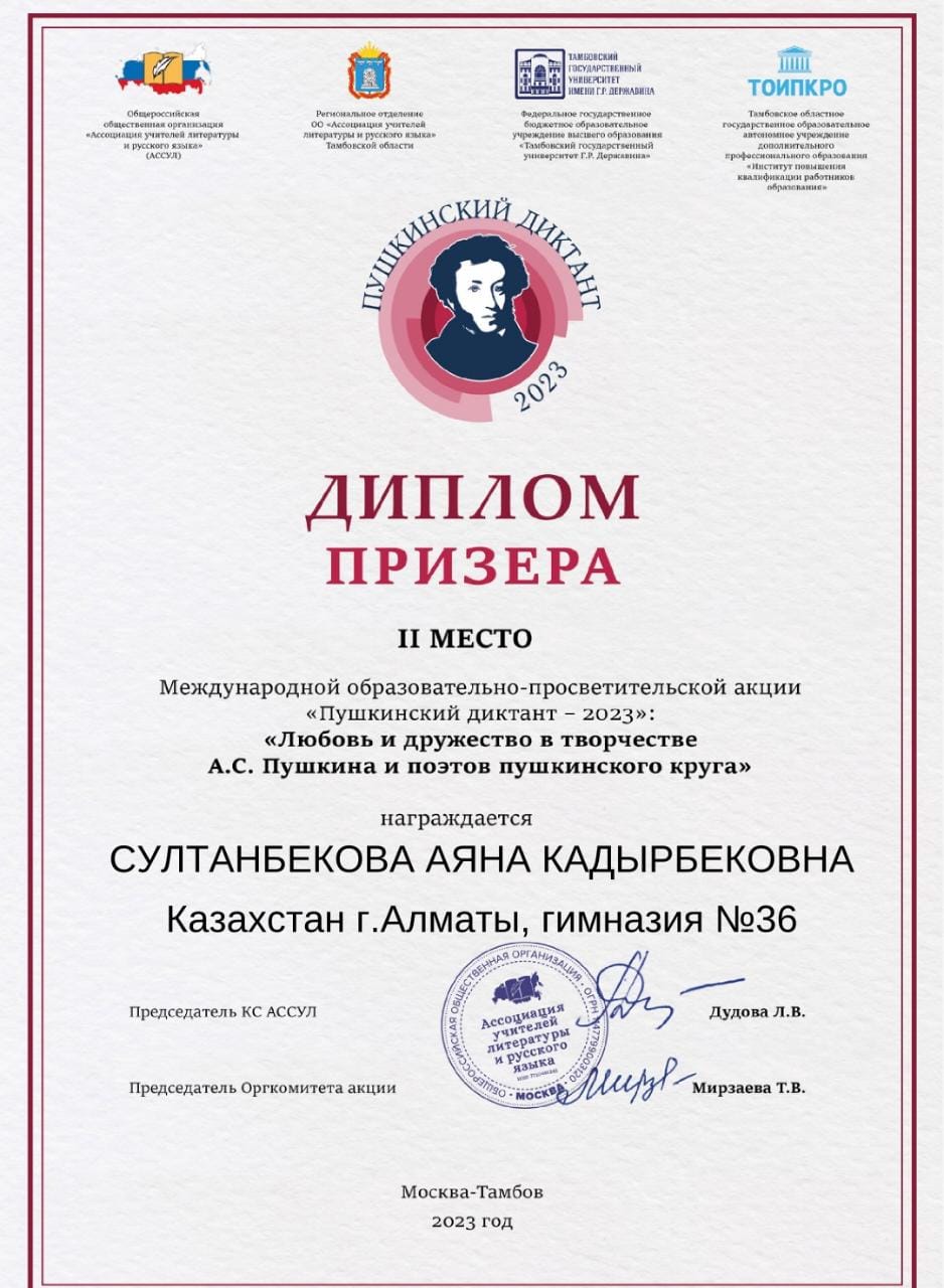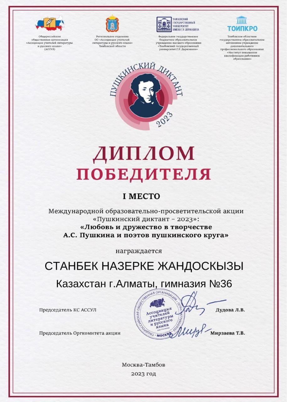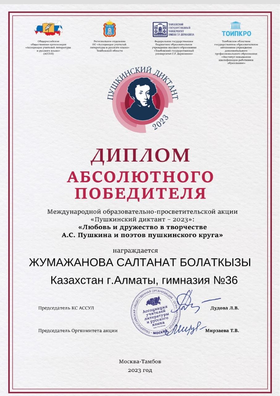 Под руководством Тулебаевой Салтанат Жаксылыковны учителя русского языка и литературы гимназии №36 им. Б.Атыханұлы ученики гимназии приняли активное участие в Международной просветительской акции «ПУШКИНСКИЙ ДИКТАНТ – 2023» и получили призовые места.