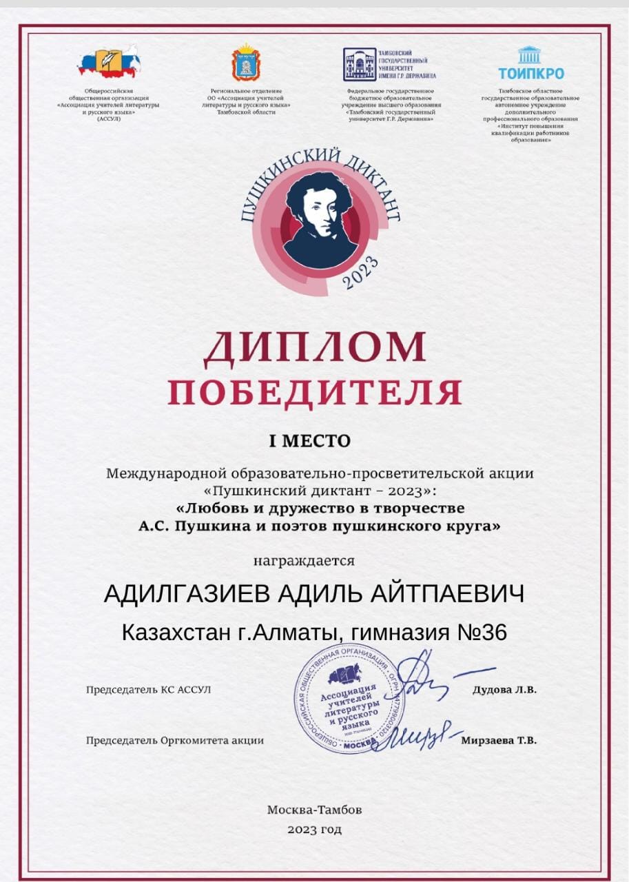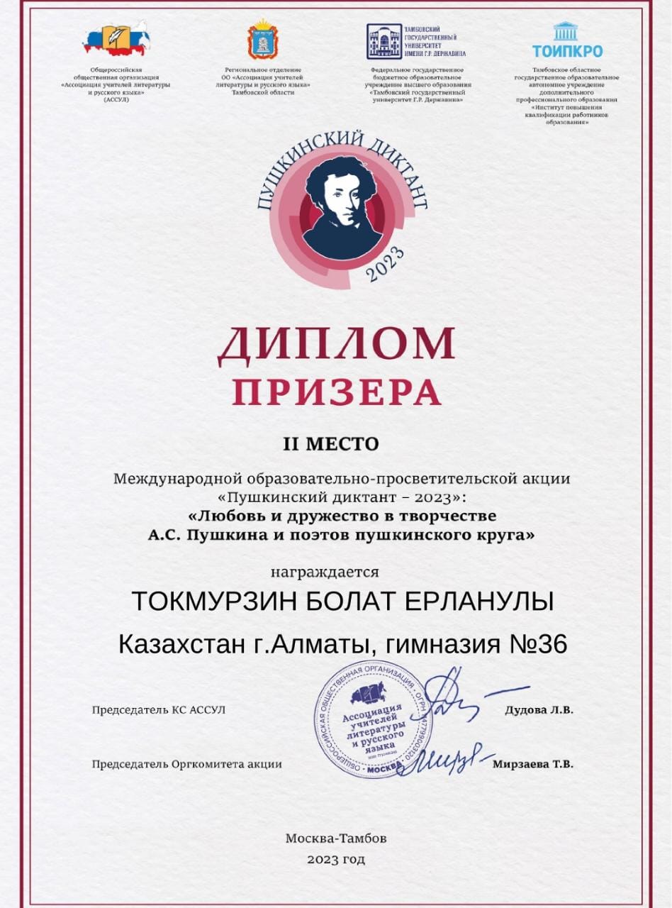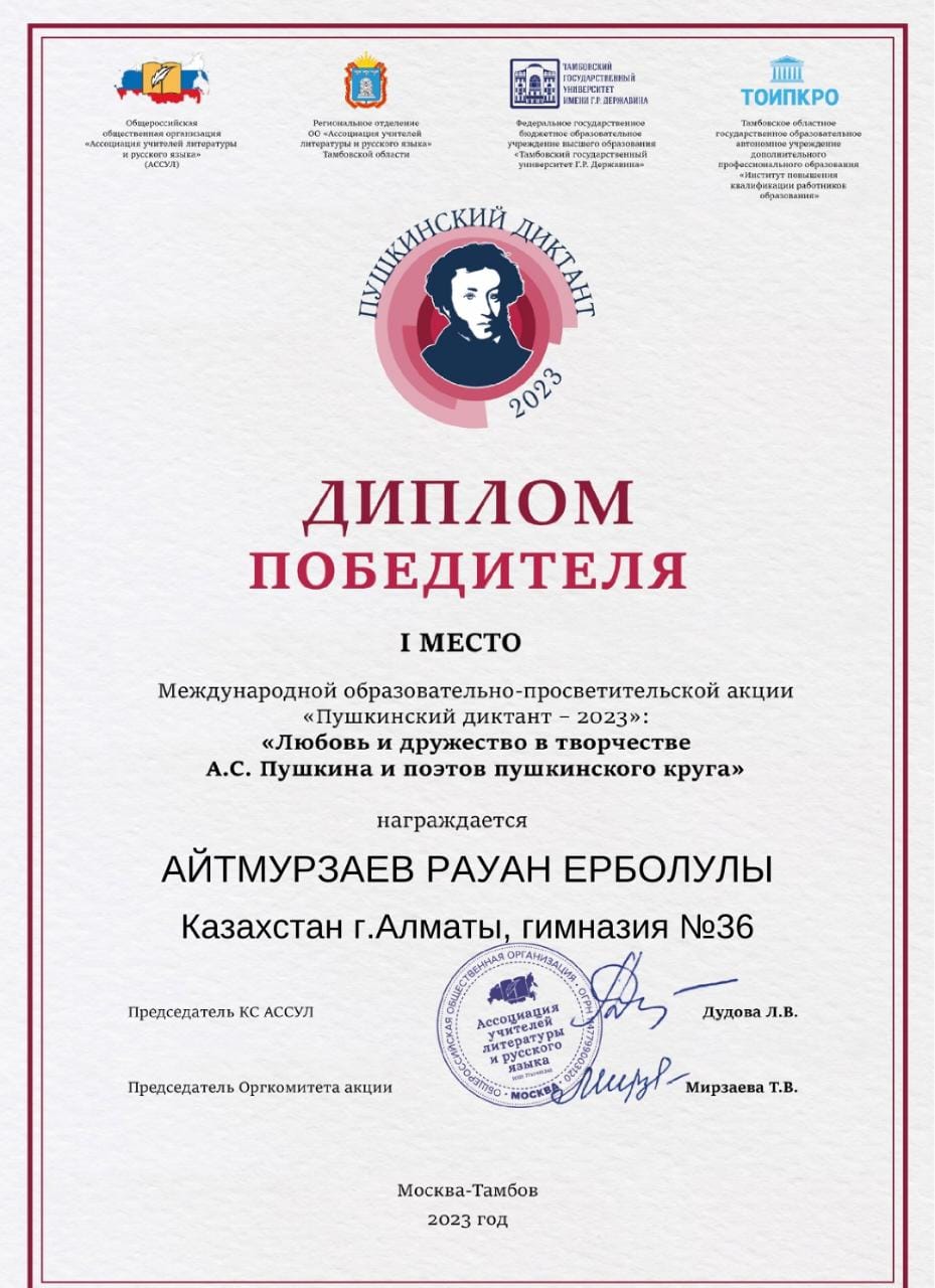 Под руководством Тулебаевой Салтанат Жаксылыковны учителя русского языка и литературы гимназии №36 им. Б.Атыханұлы ученики гимназии приняли активное участие в Международной просветительской акции «ПУШКИНСКИЙ ДИКТАНТ – 2023» и получили призовые места.