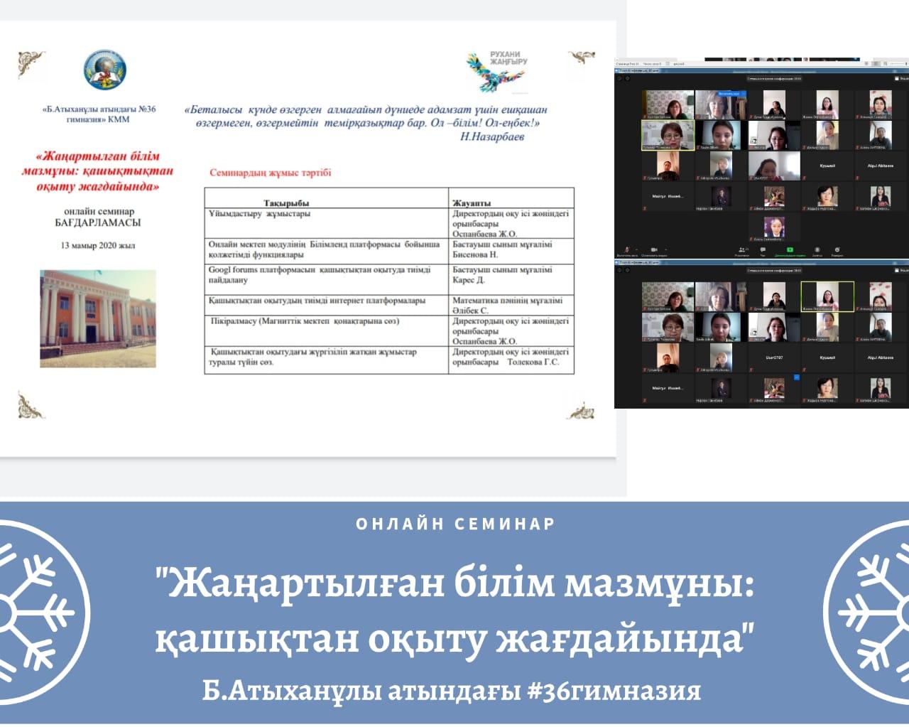13 мамыр күні гимназия басшысы А.М.Ақсерікованың қолдауымен тірек мектеп ретінде ұстаздарымыз «Жаңартылған білім мазмұны: қашықтықтан оқыту жағдайында» тақырыбында онлайн семинар өткізіп, іс-тәжірибелерімен бөлісті. Семинарға Алмалы ауданына қарасты магниттік қазақ мектептерінің мұғалімдері қатысып, өз ойларын да ортаға салды.