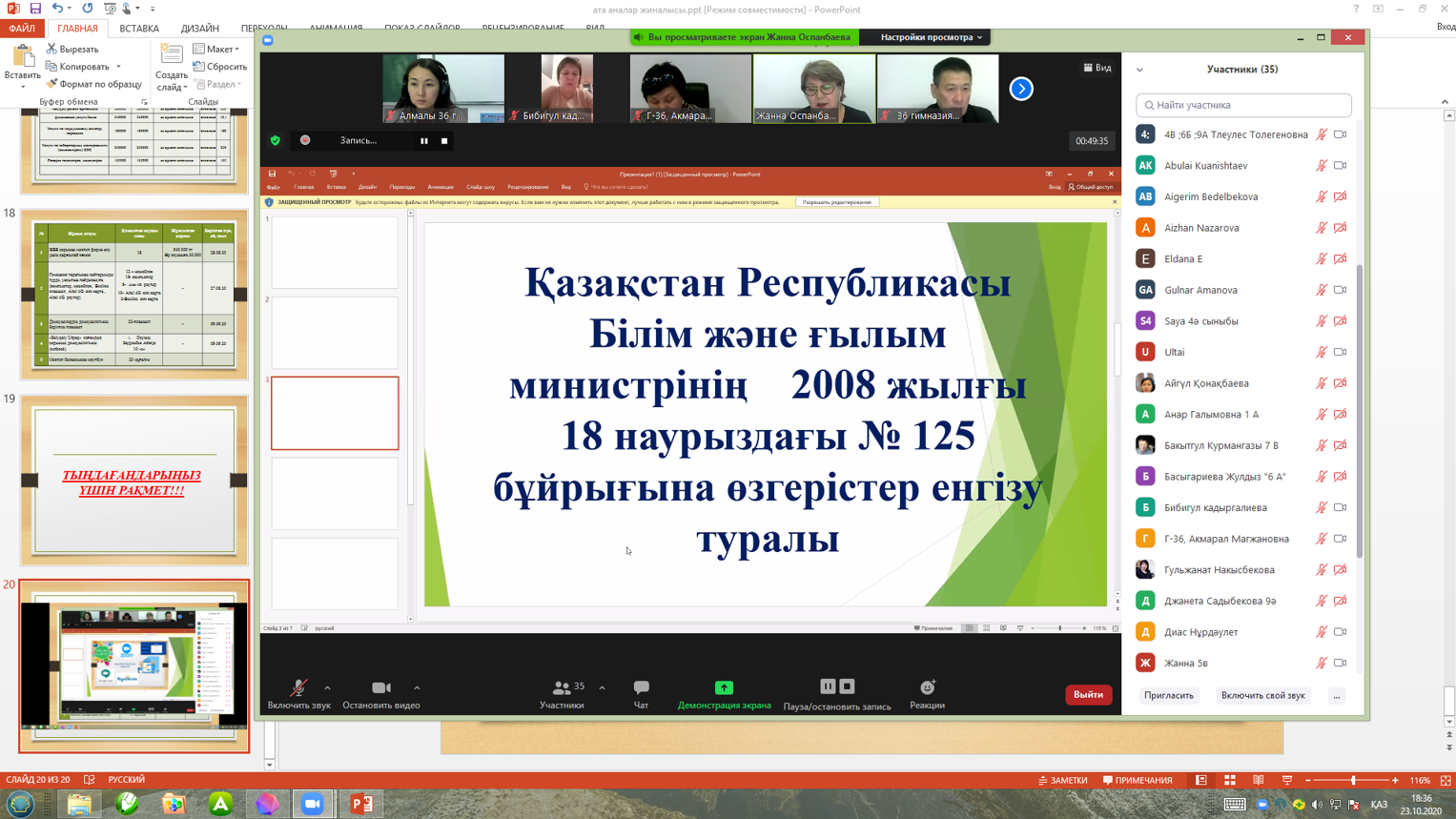 Б. Атыханұлы атындағы №36 гимназияда 24.10.2020 күні жалпы ата-аналар жиналысы онлайн түрінде өткізілді. Күн тәртібінде 2020 жылдың ІІІ кварталында бюджеттен бөлінген қаржының кіріс – шығыс есебі тыңдалды және 2020-2021 оқу жылындағы қашықтан оқу жұмыстарының ерекшеліктерімен таныстырылды.
