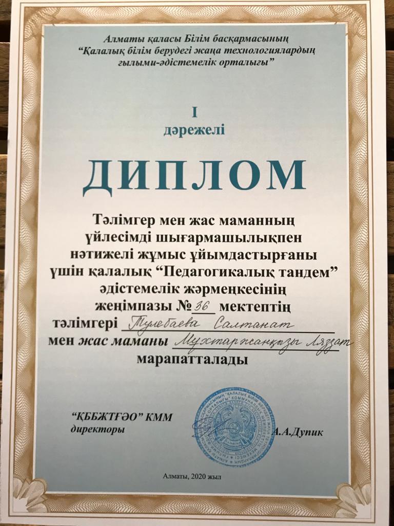 Тәлімгер мен жас маманның үйлесімді шығармашылықпен нәтижелі жұмыс ұйымдастырғаны үшін Алматы қалалық “Педагогикалық тандем” әдістемелік жәрмеңкесінен жеңімпаздары жүлделі I орынга №36 гимназияның тәлiмгер ұстазы Тулебаева Салтанат Жаксылыковна мен жас маман Мұхтаржанқызы Ляззат марапатталды.