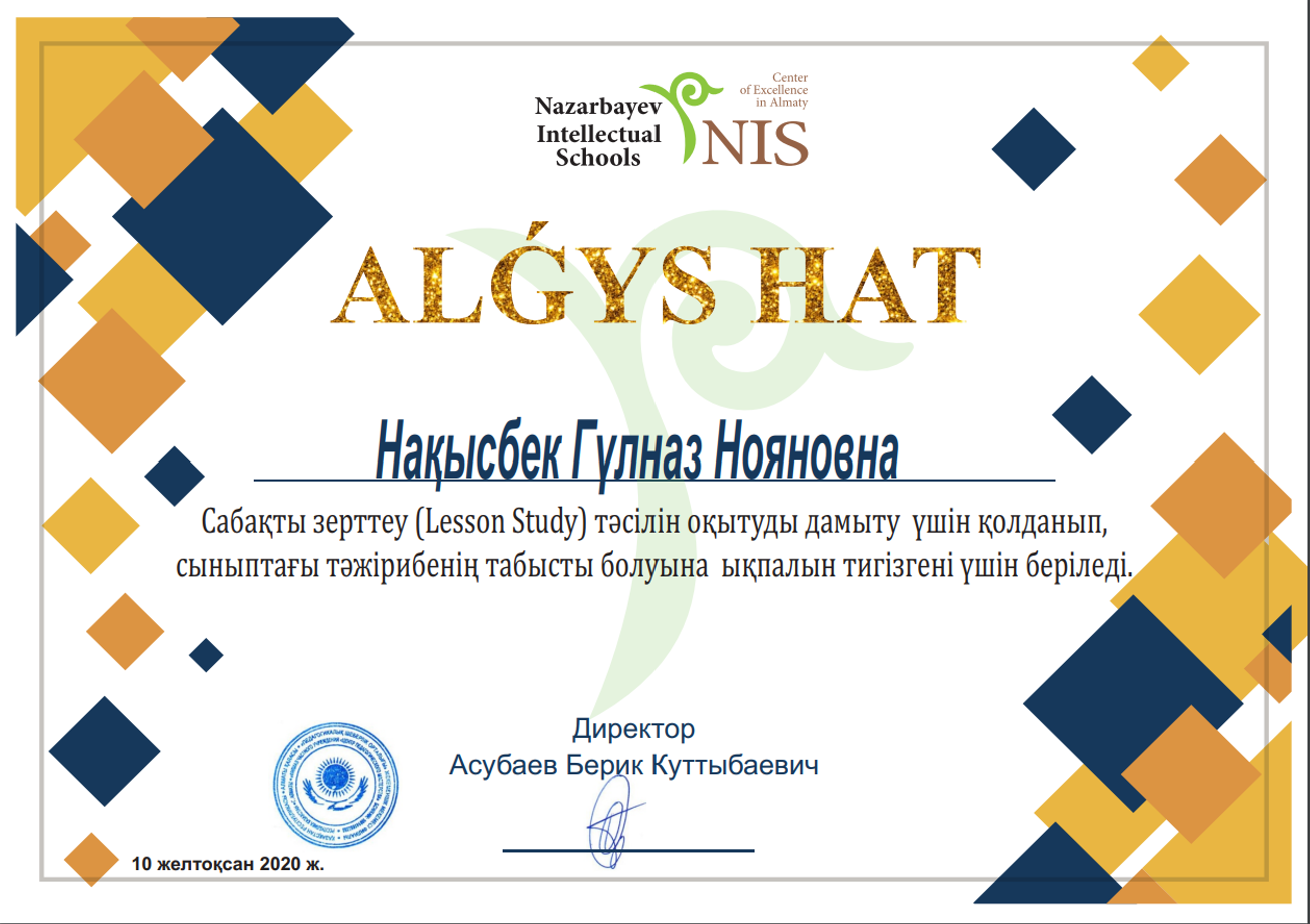 Алматы қаласы Білім басқармасының бұйрығымен құрылған жетекші мектептер арасында Алматы қаласы "Назарбаев Зияткерлік мектебі" ДББҰ Педагогикалық шеберлік орталығының басшысы Асубаев Берік Құттыбаевичтің басшылығымен және тренер Ғалия Нұрмановнаның ұйымдастыруымен ZOOM платформасында жиын өтті. Жиында осы уақытқа дейінгі жетекші мектептердің білім беру процесінде тиімді қолданылған өз идеяларымен бөлісіп, біршама атқарылған жұмыстары қорытындыланды. Сонымен қатар, №36 гимназияның басшысы Ақсерікова Ақмарал Мағжанқызы, гимназия мұғалімдері Толекова Г.С., Оспанбаева Ж.О., Уразымбетова А.М., Нақысбек Г.Н., Жарасова А.О., Маймышева А.А. Сабақты зерттеу тәсілін (Lesson Study) оқытуды дамыту үшін қолданып, сыныптағы тәжірибенің табысты болуына ықпалын тигізгені үшін марапатталды.