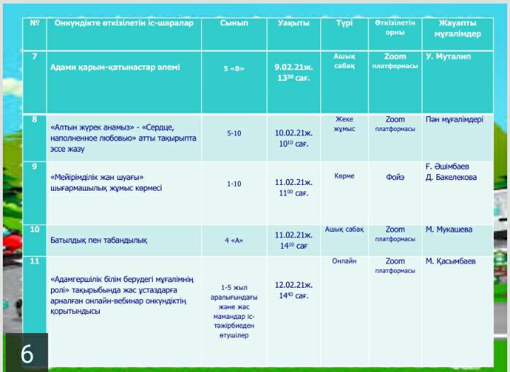 01 ақпан 2021 0 1 2 3 4 5 Өзін-өзі тану: Махаббат пен шығармашылық педагогикасы» тақырыбында өткізілетін онкүндік Қоғамдық гуманитарлық пән кафедрасының «Өзін-өзі тану: Махаббат пен шығармашылық педагогикасы» тақырыбында өткізілетін онкүндік жоспары (1-12.02.21 ақпан) Осы беттің QR-коды:QR-код этой страницы:
