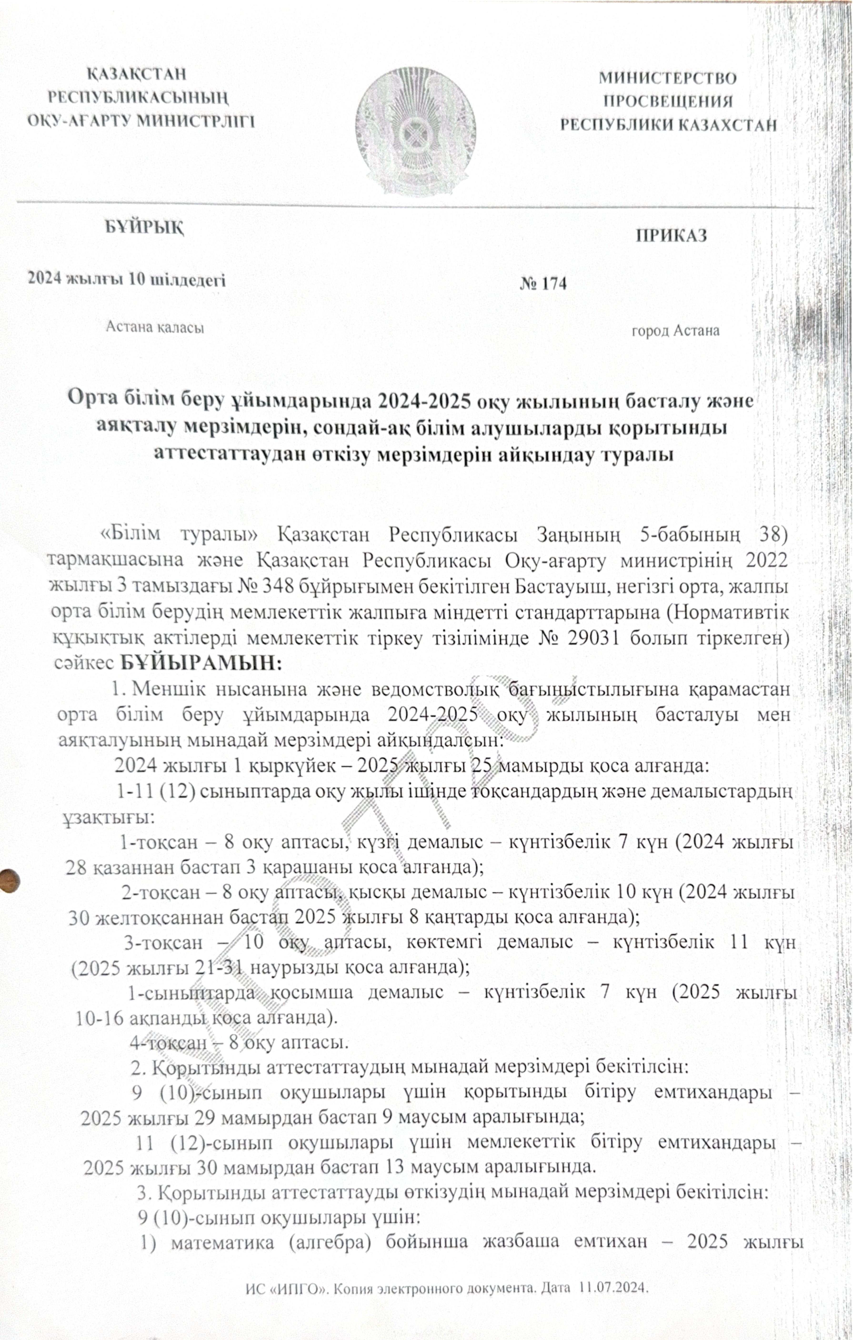 02 қыркүйек 2024 0 1 2 3 4 5 БҰЙРЫҚ №124 2024-2025 оқу жылының басталуын, ұзақтығын және каникул кезеңдерін айқындау туралы Осы беттің QR-коды:QR-код этой страницы: