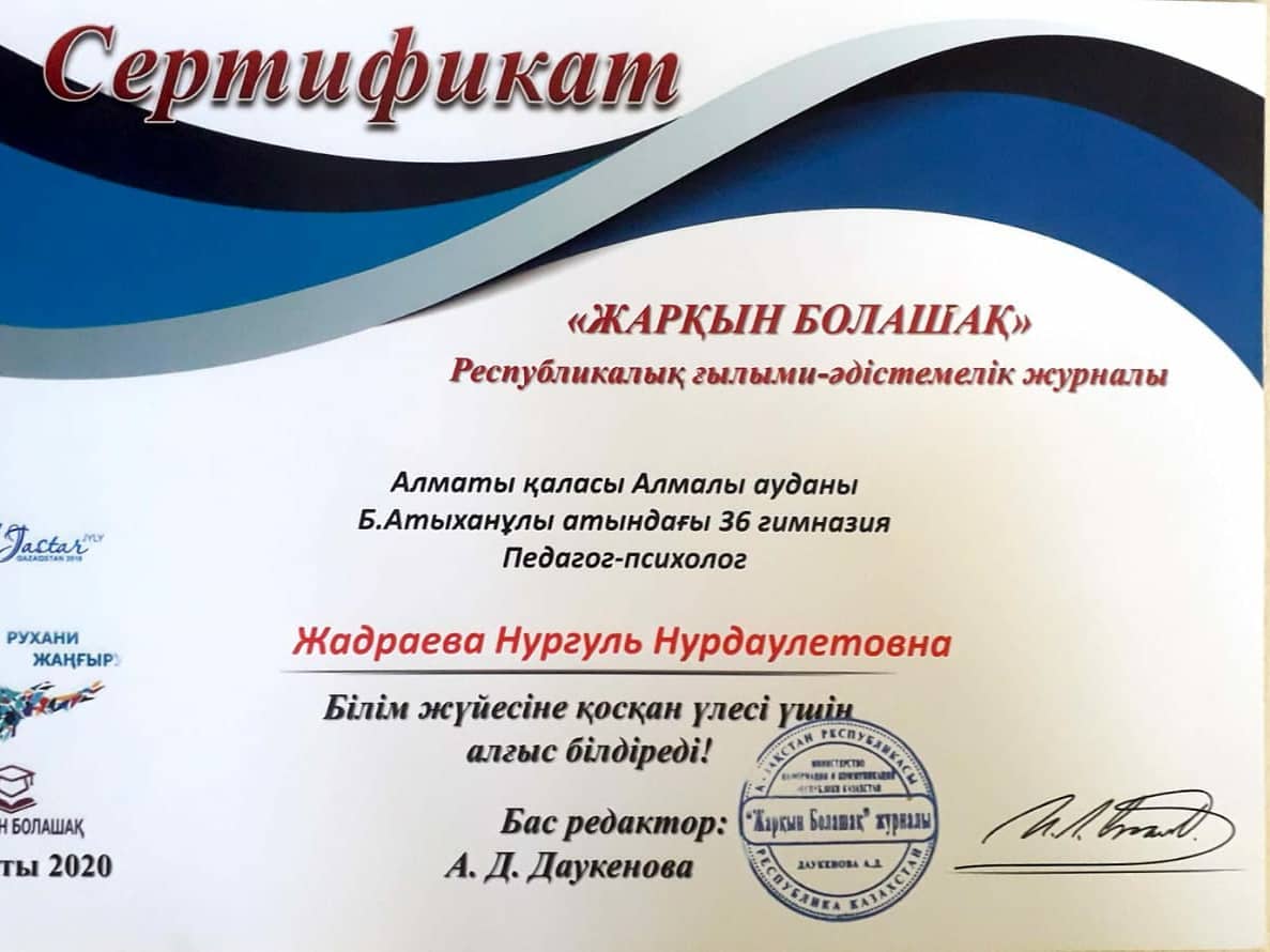 05 қазан 2020 0 1 2 3 4 5 "Үздік педагог-2020" Республикалық байқауы Республикалық ұстаздар арасындағы "Үздік педагог-2020" атты байқауға ұсынған жұмыстары үздік деп танылып I орынды жеңіп алғаны үшін Б.Атынханұлы атындағы @36 гимназиның педагог-психологы Нургуль Нурдаулетовна марапатталды.Құттықтаймыз!!!#36gimnazium Осы беттің QR-коды:QR-код этой страницы: Голосовать Результаты