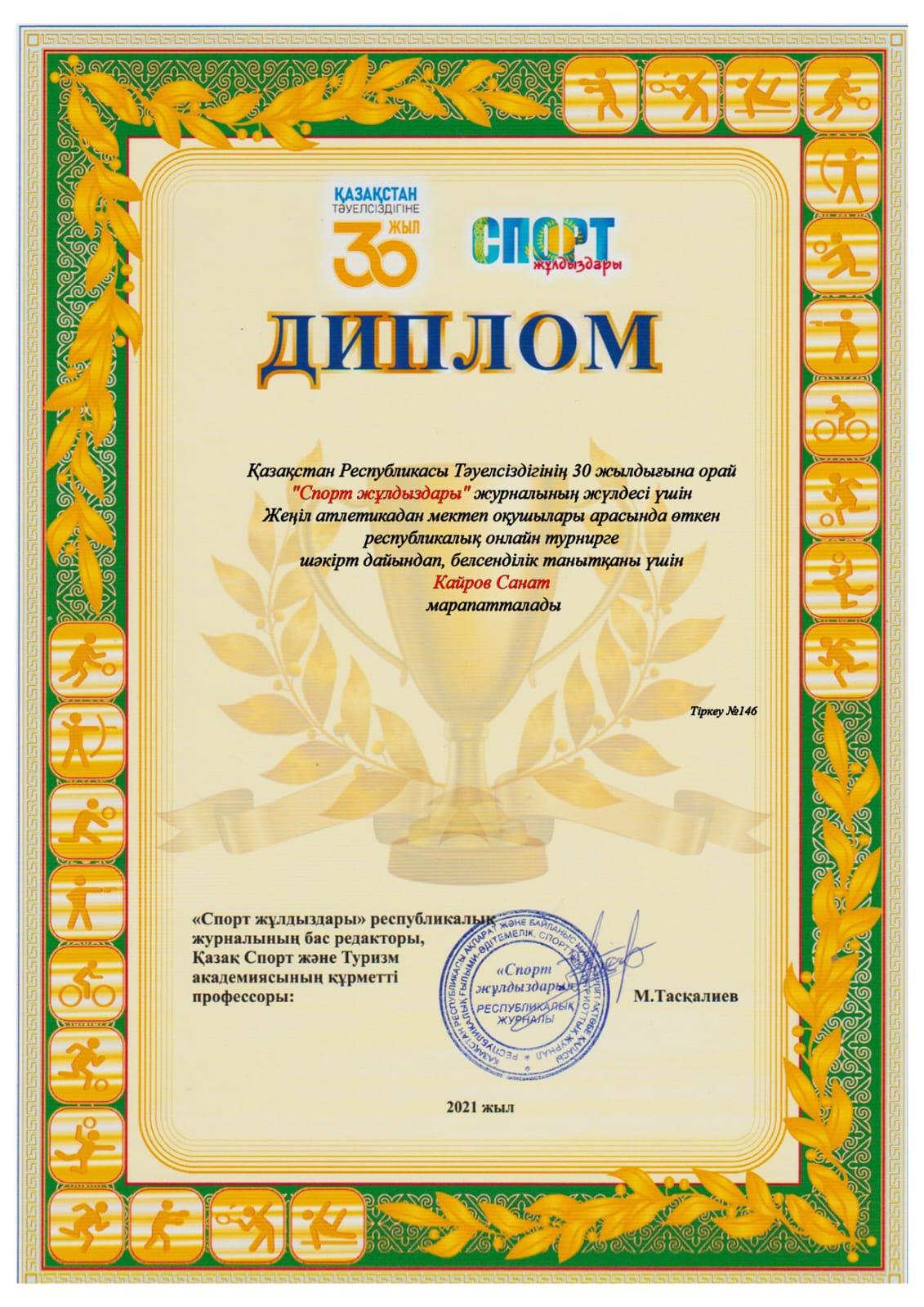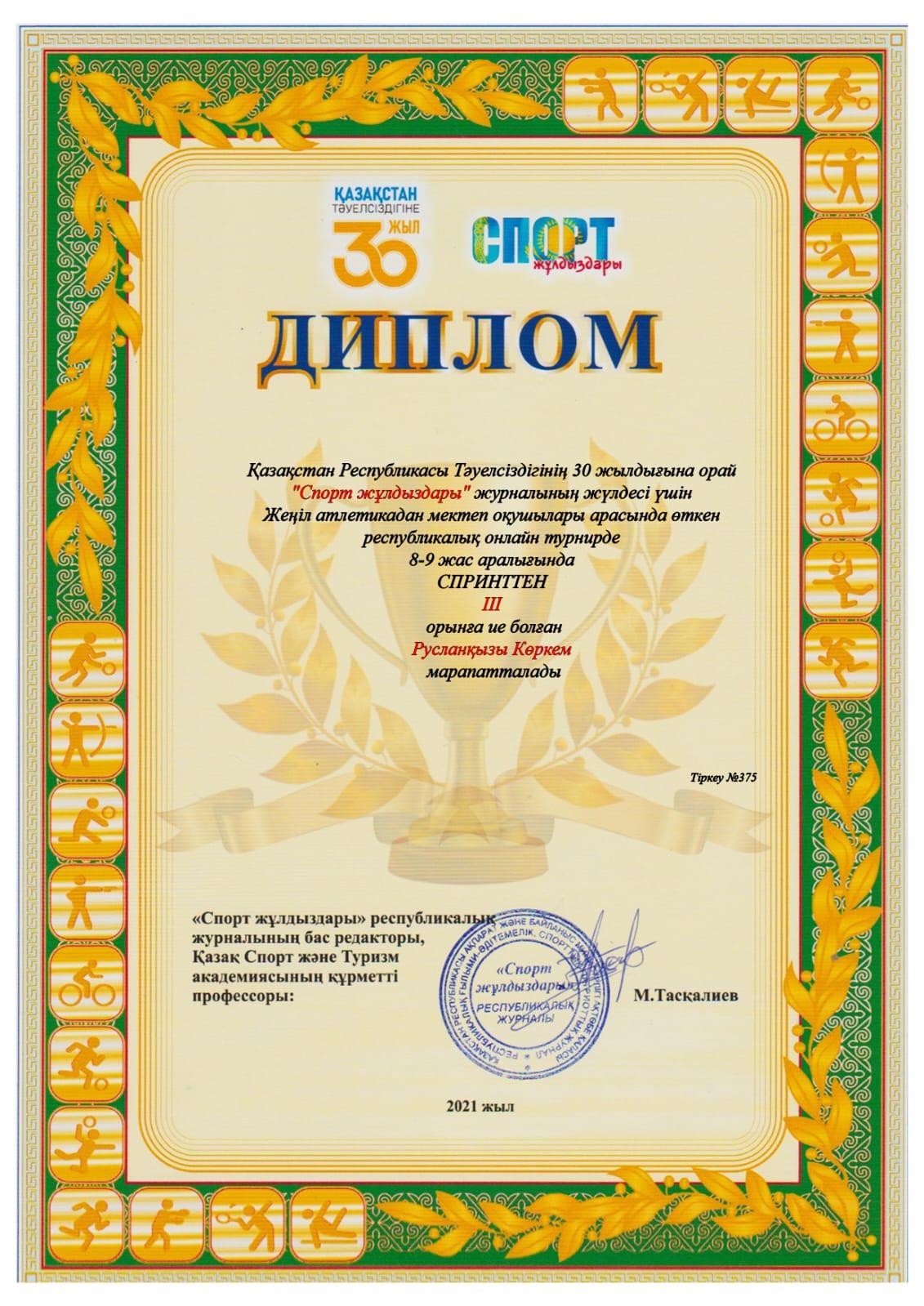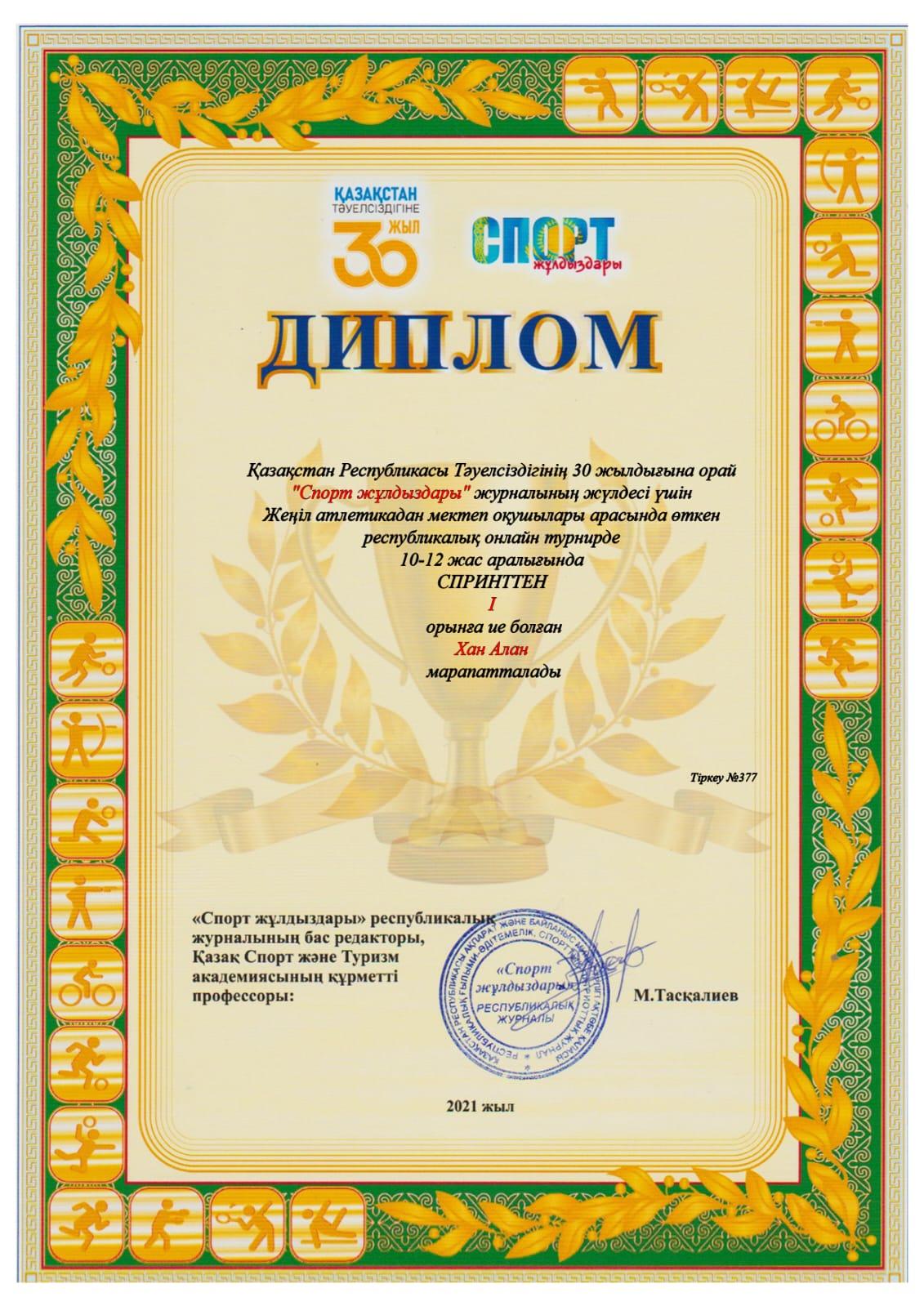 19 қазан 2021 0 1 2 3 4 5 Гимназия оқушыларының жетістіктері Қазақстан Республикасының 30 жылдығына орай өткізілген "Спорт жұлдыздары" жеңіл атлетикадан мектеп оқушылары арасында өткен Республикалық онлайн турнир жеңімпаздары Осы беттің QR-коды:QR-код этой страницы: