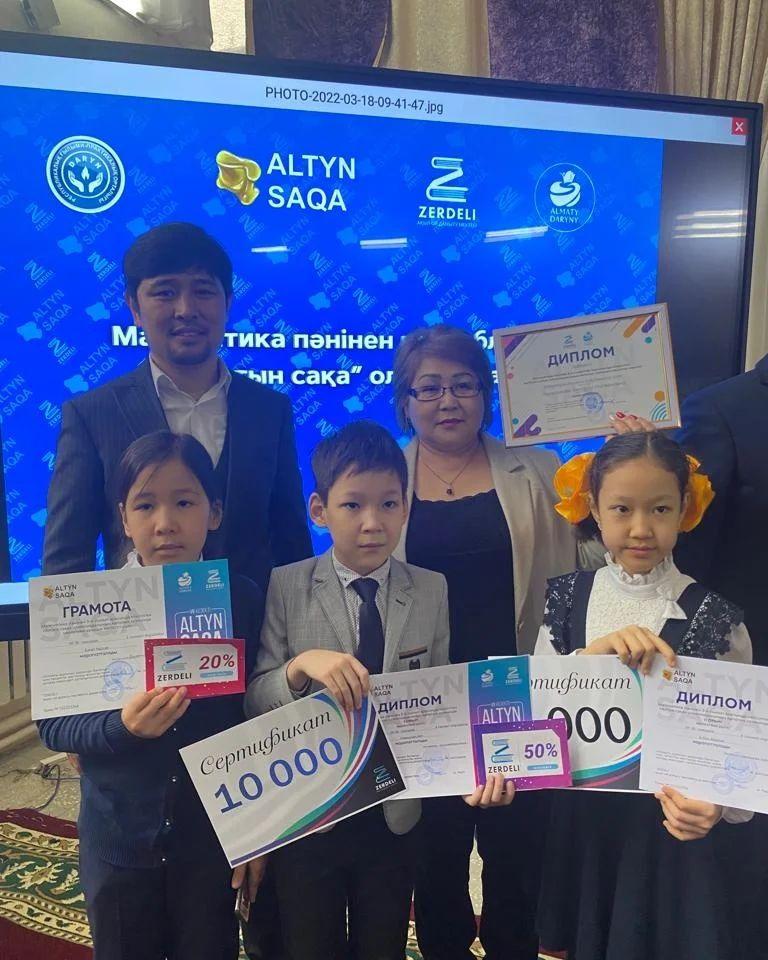 "Білімді мыңды жығады, білекті бірді жығады" - деген қазақ мақалында айтылғандай , гимназиямыздың оқушылары математика пәнінен 3-4 сыныптар аралығында өткізілген "АЛТЫН САҚА" олипиядасының қалалық кезеңі бойынша Мамырхан Аят I орын және 10 000 тг сертификат , II орын Есбол Аружан 5000 тг , Қанат Нұрсия 20% ынталандыру және грамота иеленді. Сонымен қатар, қала мектептерінің ішінде үздік оқушылары білім бәйгесінен оза шапқаны үшін және қалалылық кезеңнің жеңімпаз мектебі атанғаны үшін гимназия директоры А.М.Ақсерикова дипломмен марапатталды.