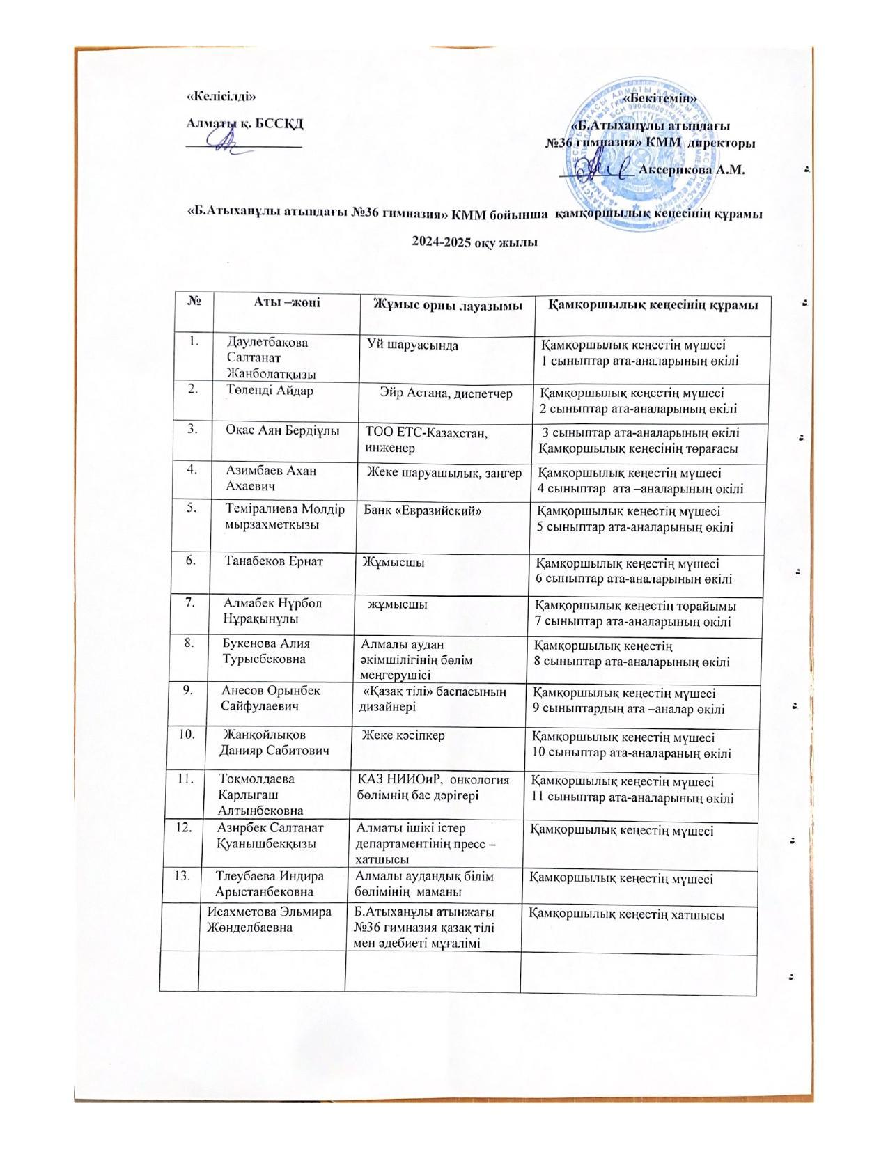 Қамқоршылық кеңес мүшелерінің тізімі 2021-2022 оқу жылы