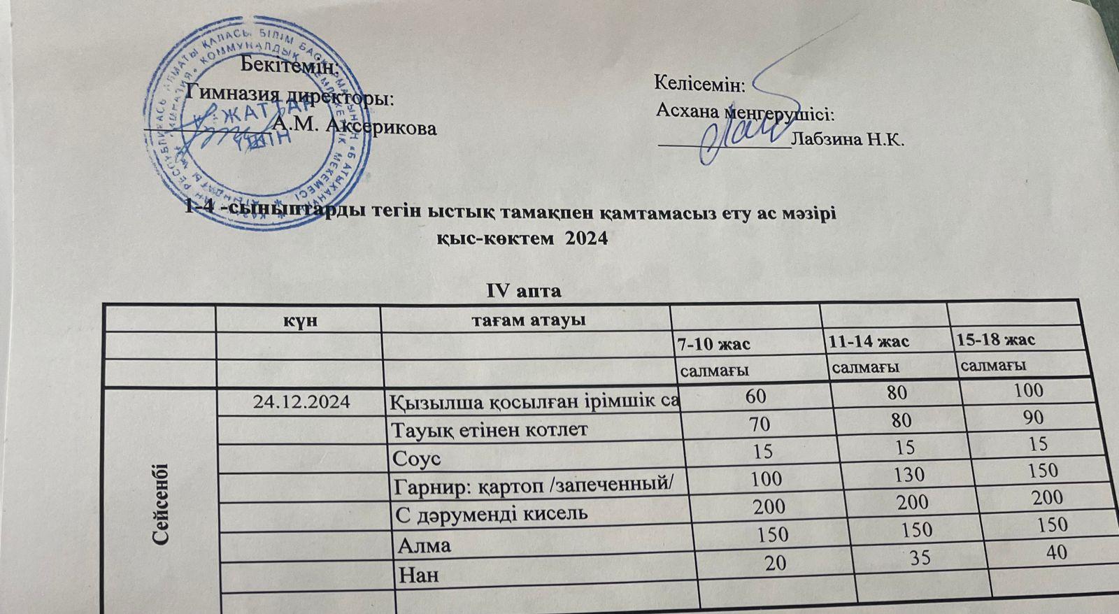 Тамақтандырудың ұйымдастыру жұмыс жоспары 2024