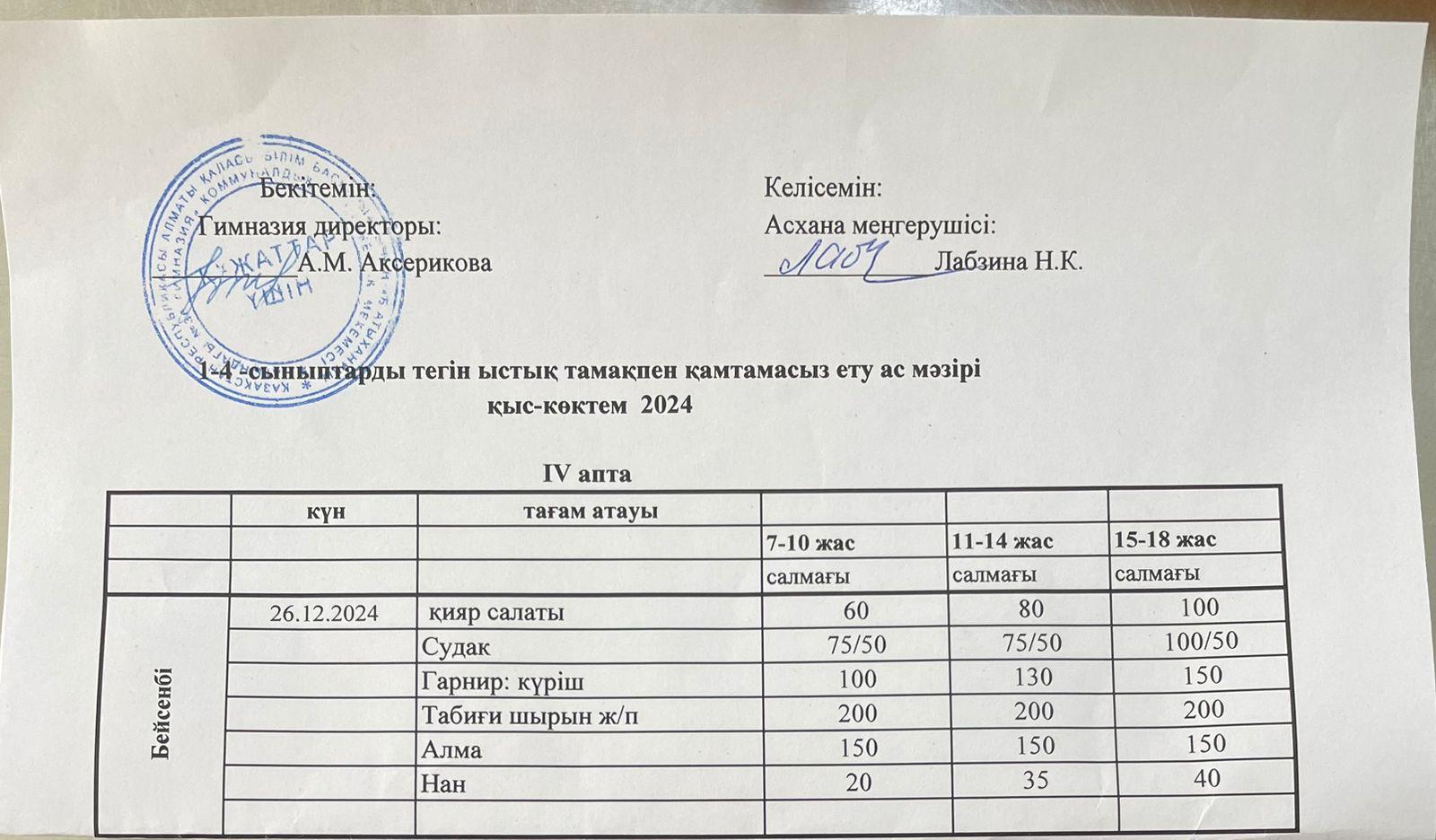 Тамақтандырудың ұйымдастыру жұмыс жоспары 2024