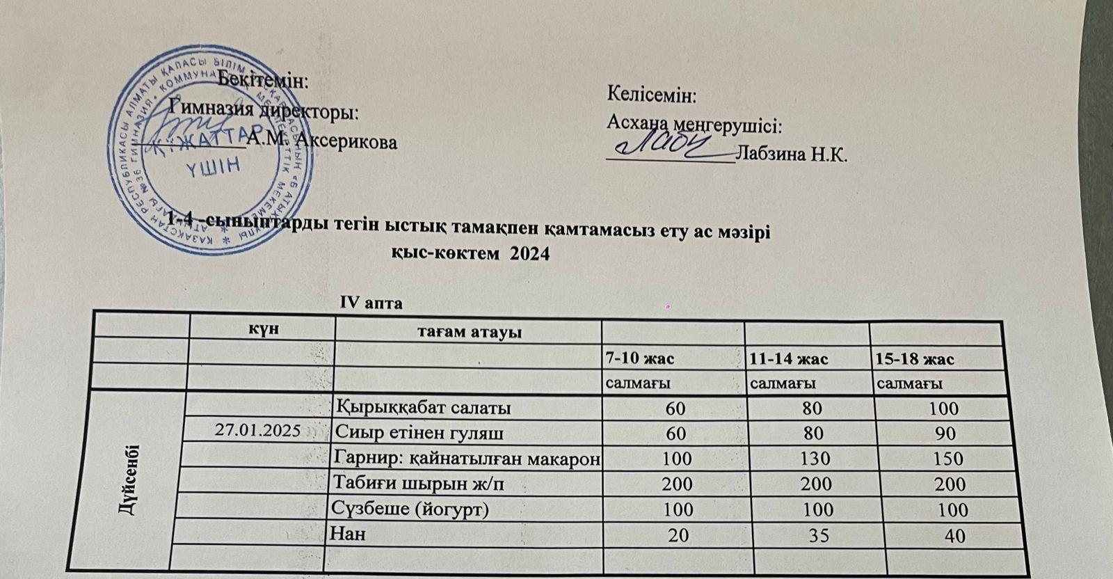 Тамақтандырудың ұйымдастыру жұмыс жоспары 2024