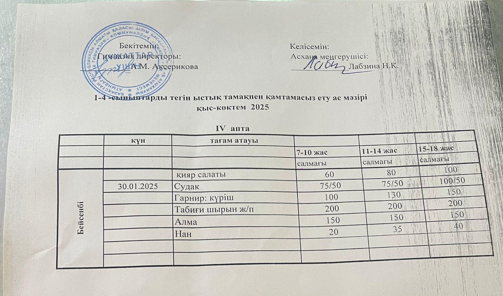 Тамақтандырудың ұйымдастыру жұмыс жоспары 2024