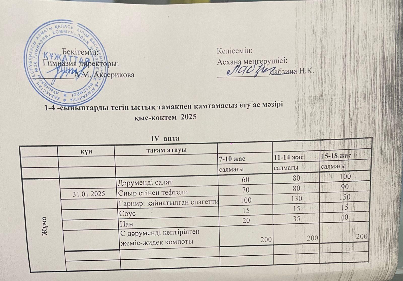 Тамақтандырудың ұйымдастыру жұмыс жоспары 2024