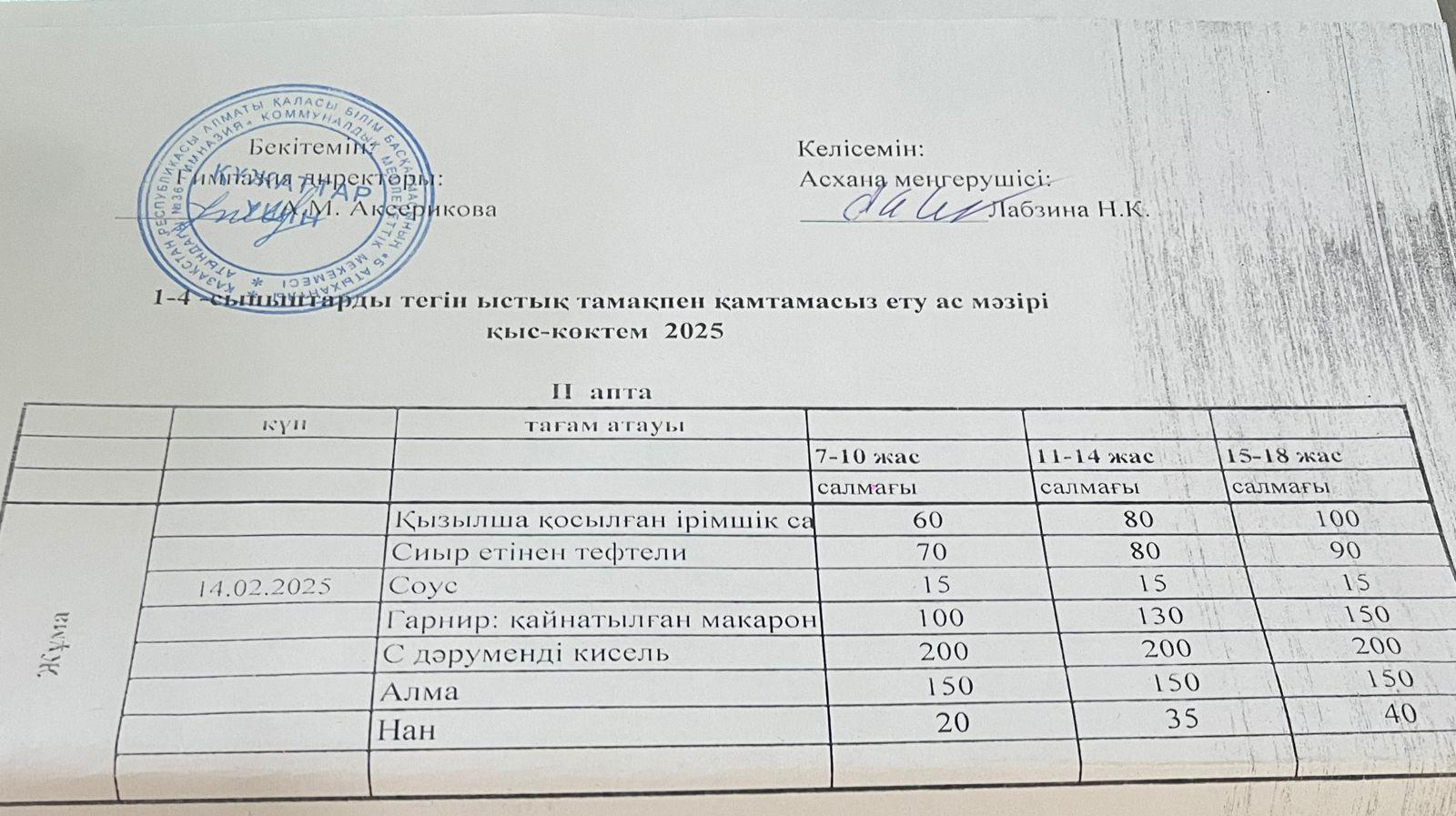 Тамақтандырудың ұйымдастыру жұмыс жоспары 2024