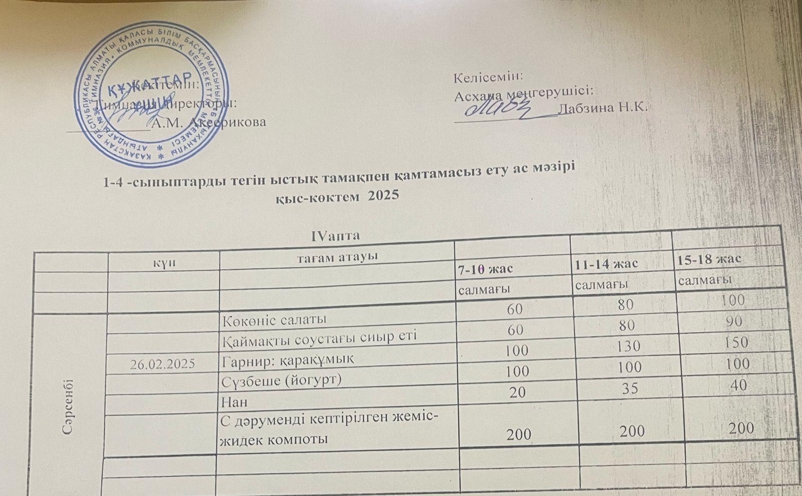 Тамақтандырудың ұйымдастыру жұмыс жоспары 2024