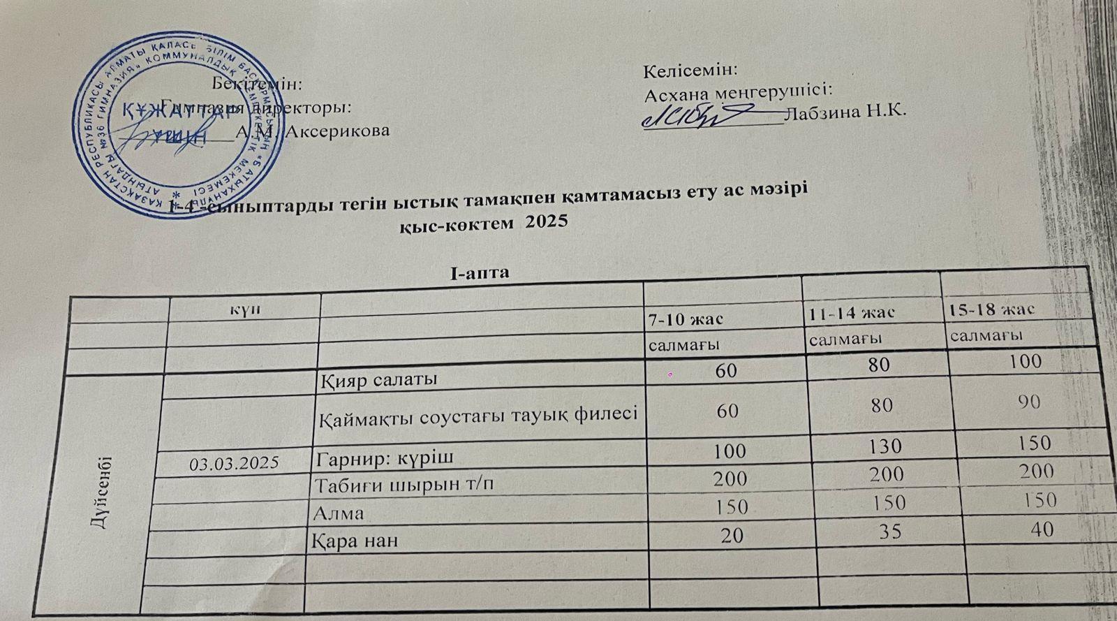 Тамақтандырудың ұйымдастыру жұмыс жоспары 2024