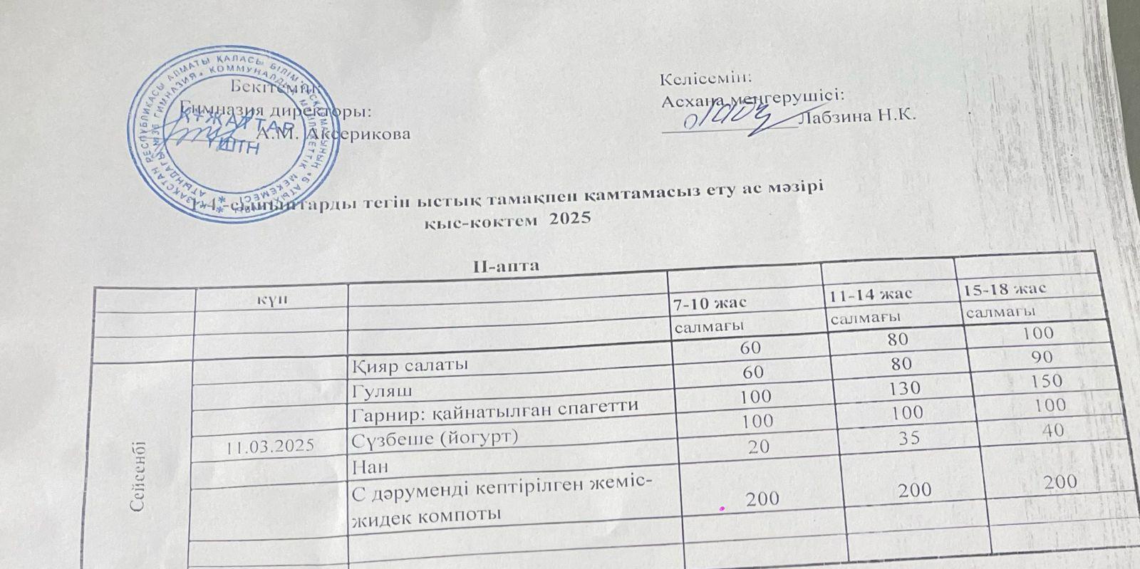Тамақтандырудың ұйымдастыру жұмыс жоспары 2024