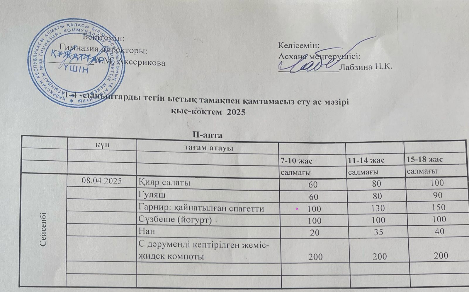 Тамақтандырудың ұйымдастыру жұмыс жоспары 2024