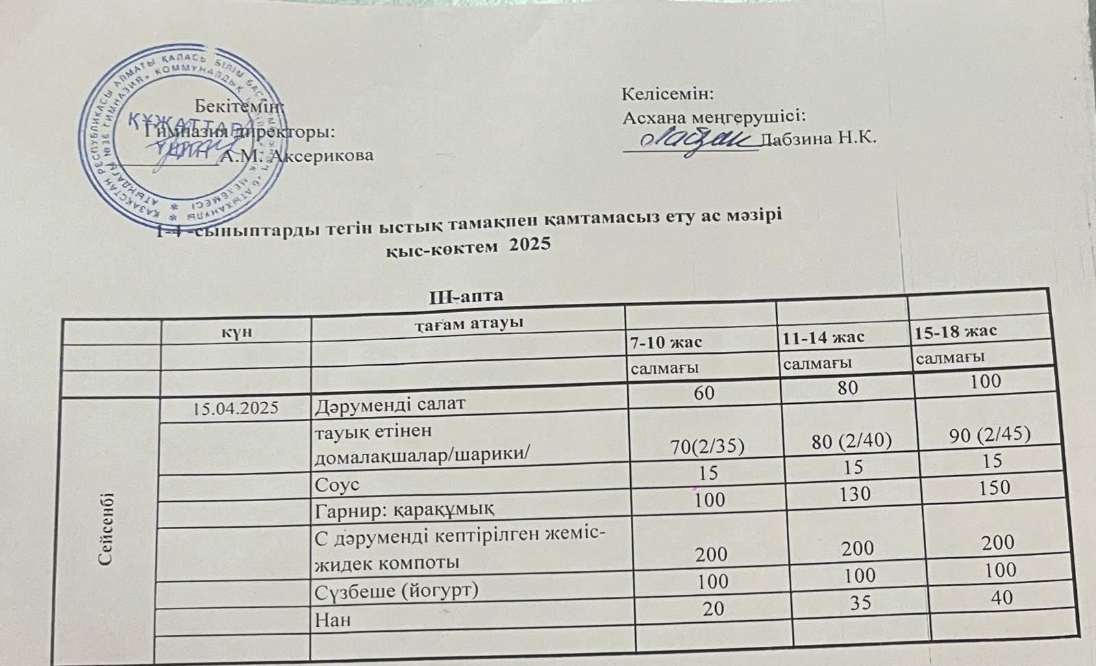 Тамақтандырудың ұйымдастыру жұмыс жоспары 2024