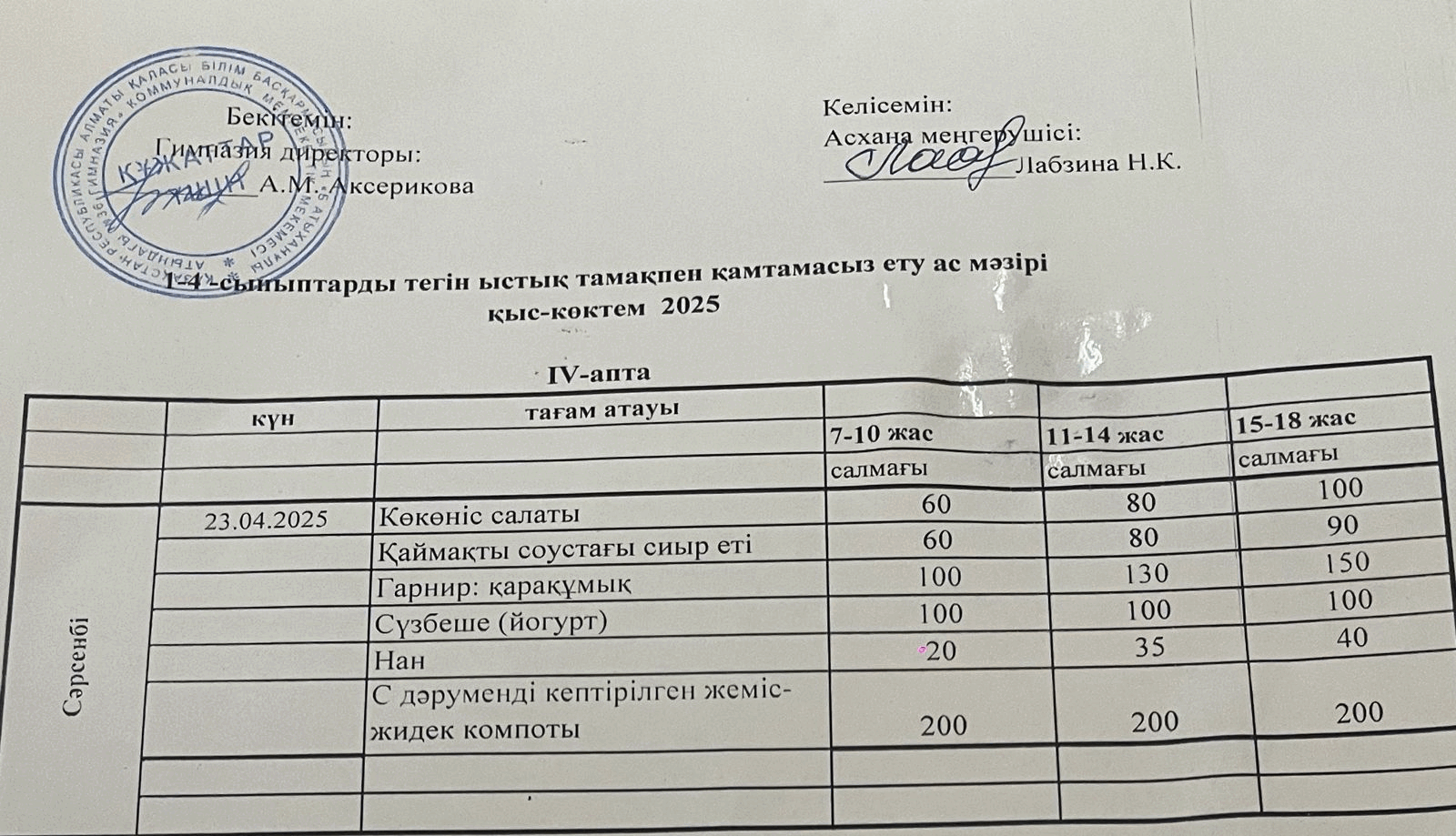 Тамақтандырудың ұйымдастыру жұмыс жоспары 2024