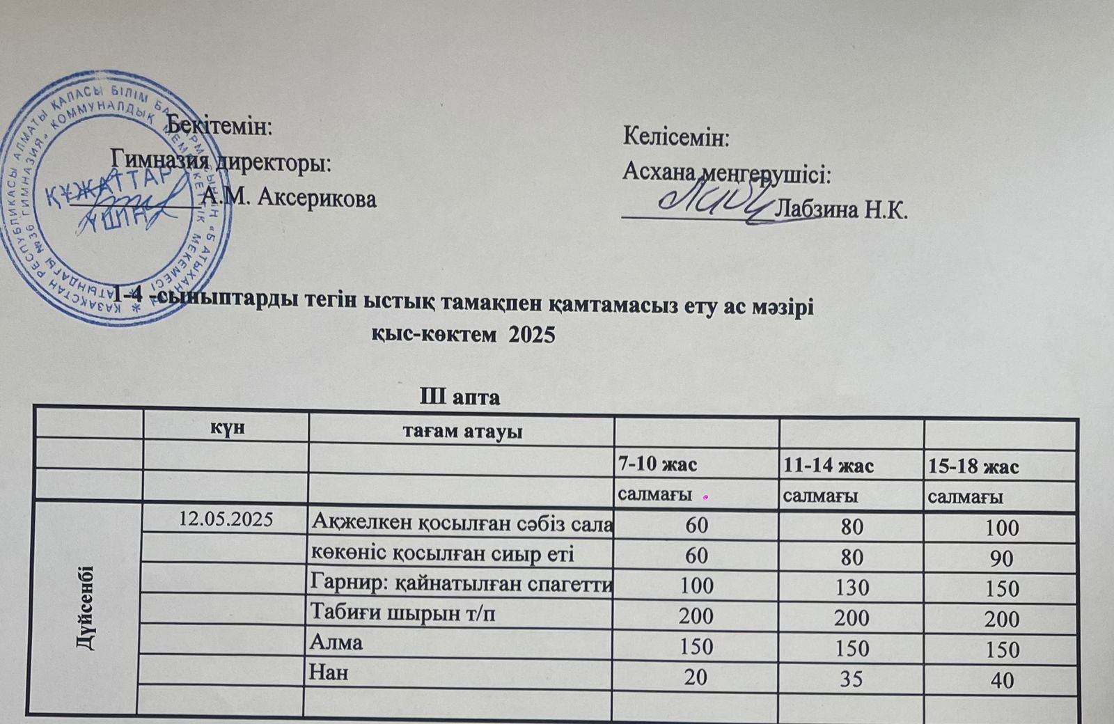 Тамақтандырудың ұйымдастыру жұмыс жоспары 2024