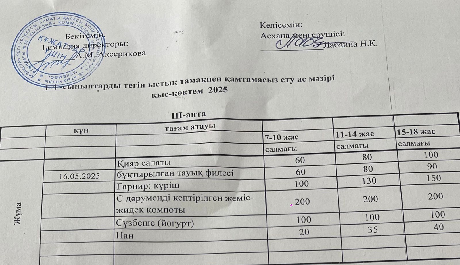 Тамақтандырудың ұйымдастыру жұмыс жоспары 2024