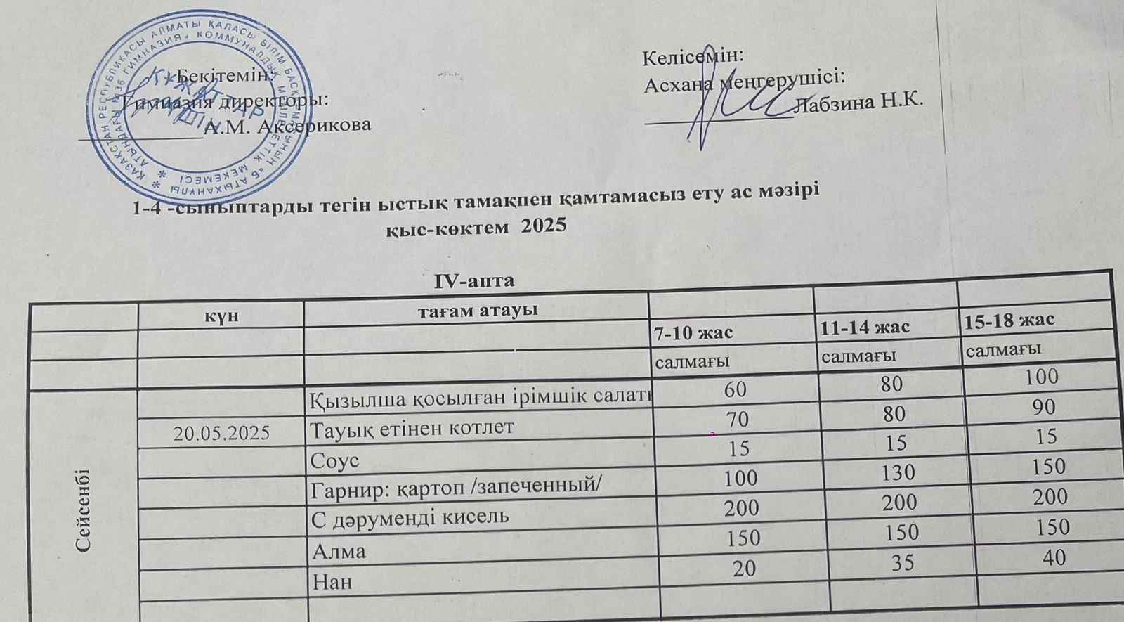 Тамақтандырудың ұйымдастыру жұмыс жоспары 2024