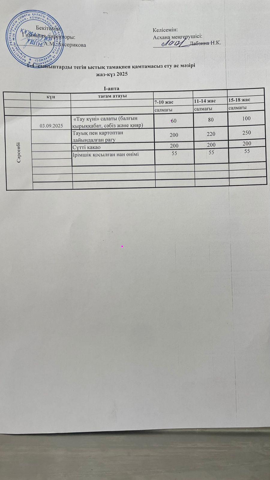 Тамақтандырудың ұйымдастыру жұмыс жоспары 2024