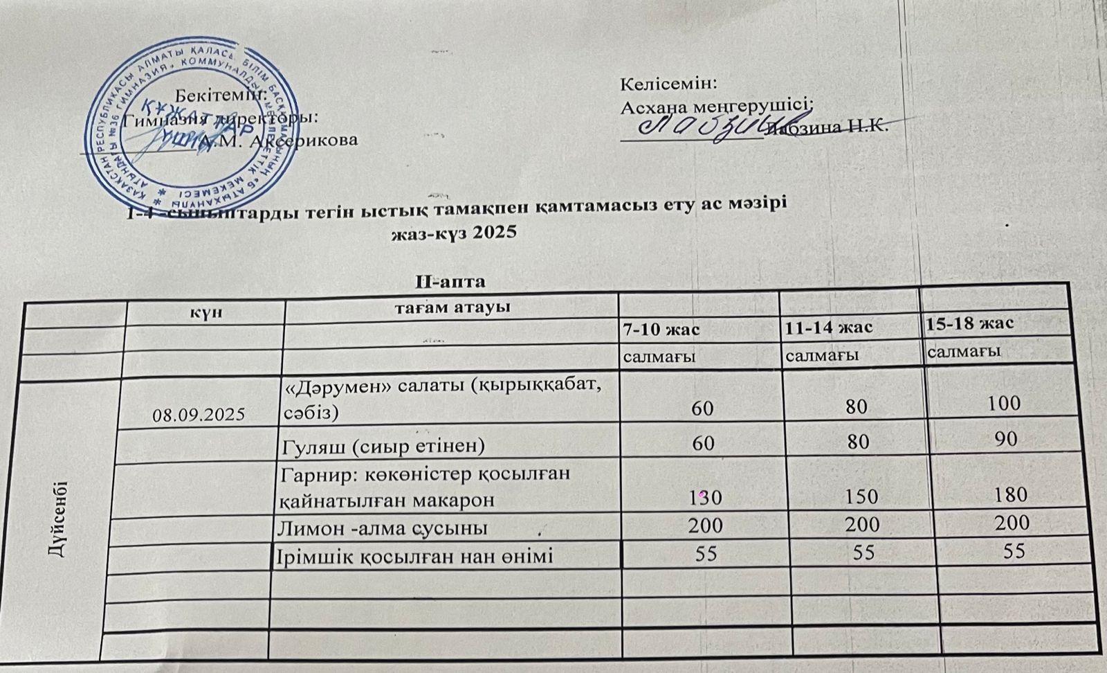 Тамақтандырудың ұйымдастыру жұмыс жоспары 2024