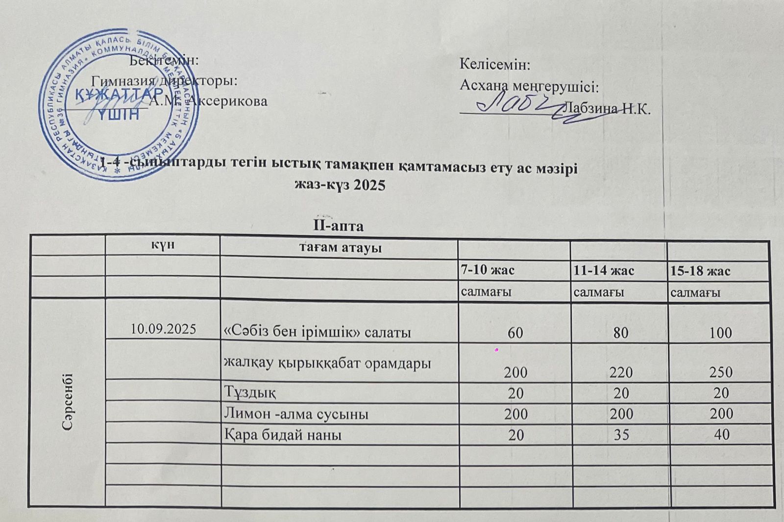 Тамақтандырудың ұйымдастыру жұмыс жоспары 2024