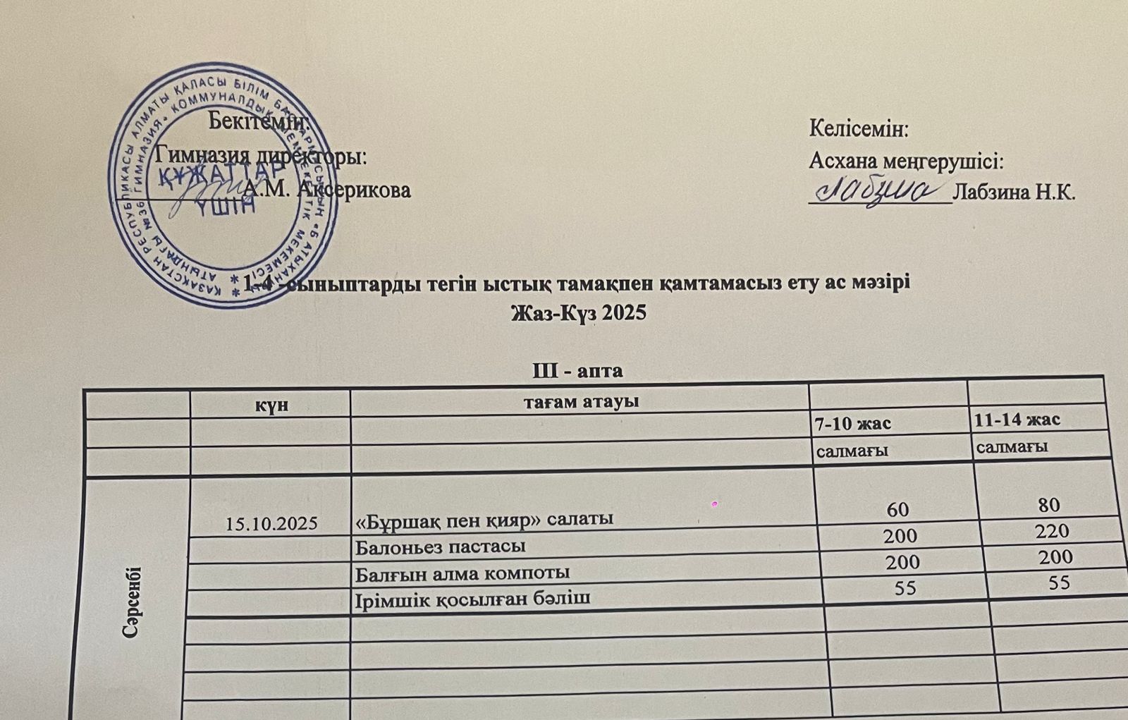 Тамақтандырудың ұйымдастыру жұмыс жоспары 2024