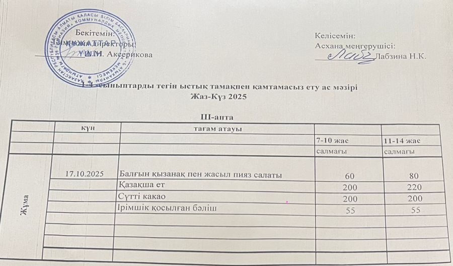Тамақтандырудың ұйымдастыру жұмыс жоспары 2024
