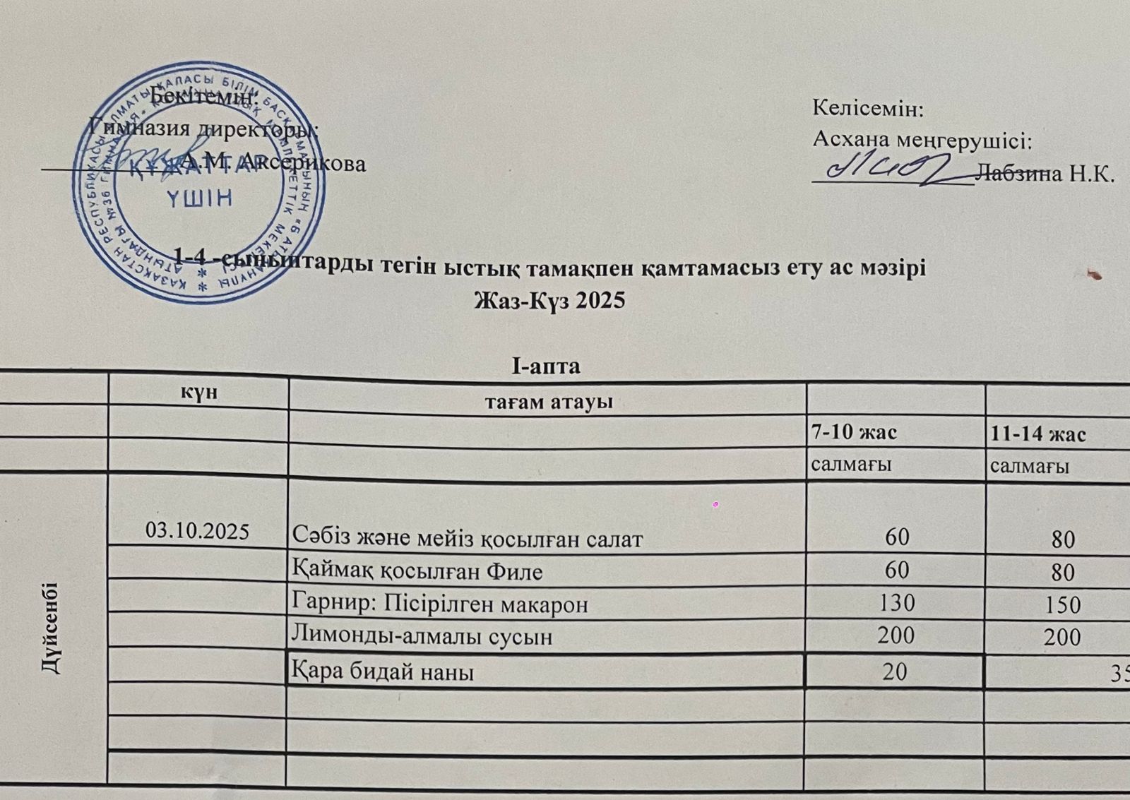 Тамақтандырудың ұйымдастыру жұмыс жоспары 2024