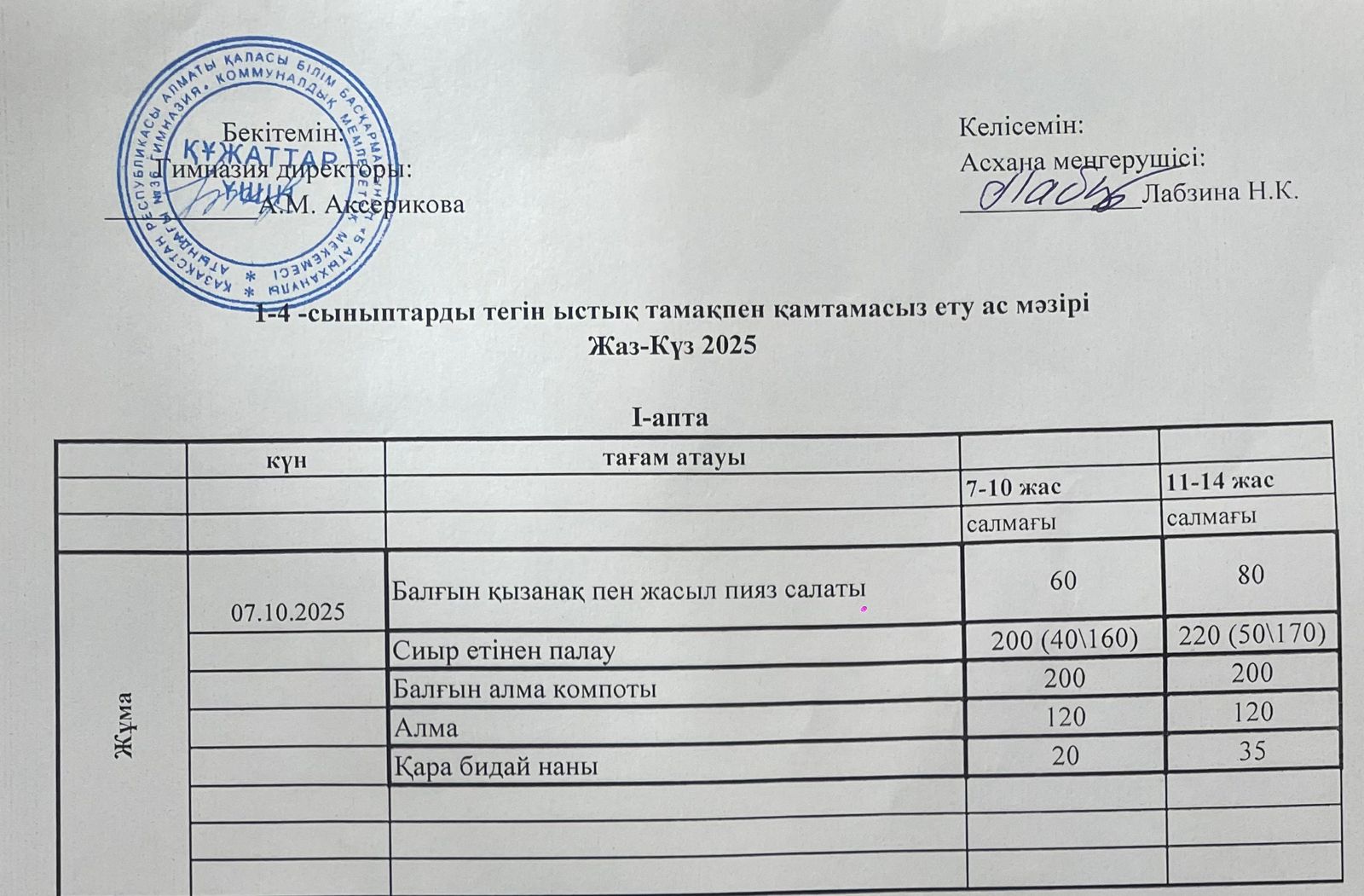 Тамақтандырудың ұйымдастыру жұмыс жоспары 2024
