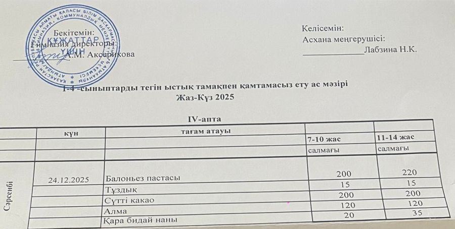 Тамақтандырудың ұйымдастыру жұмыс жоспары 2024