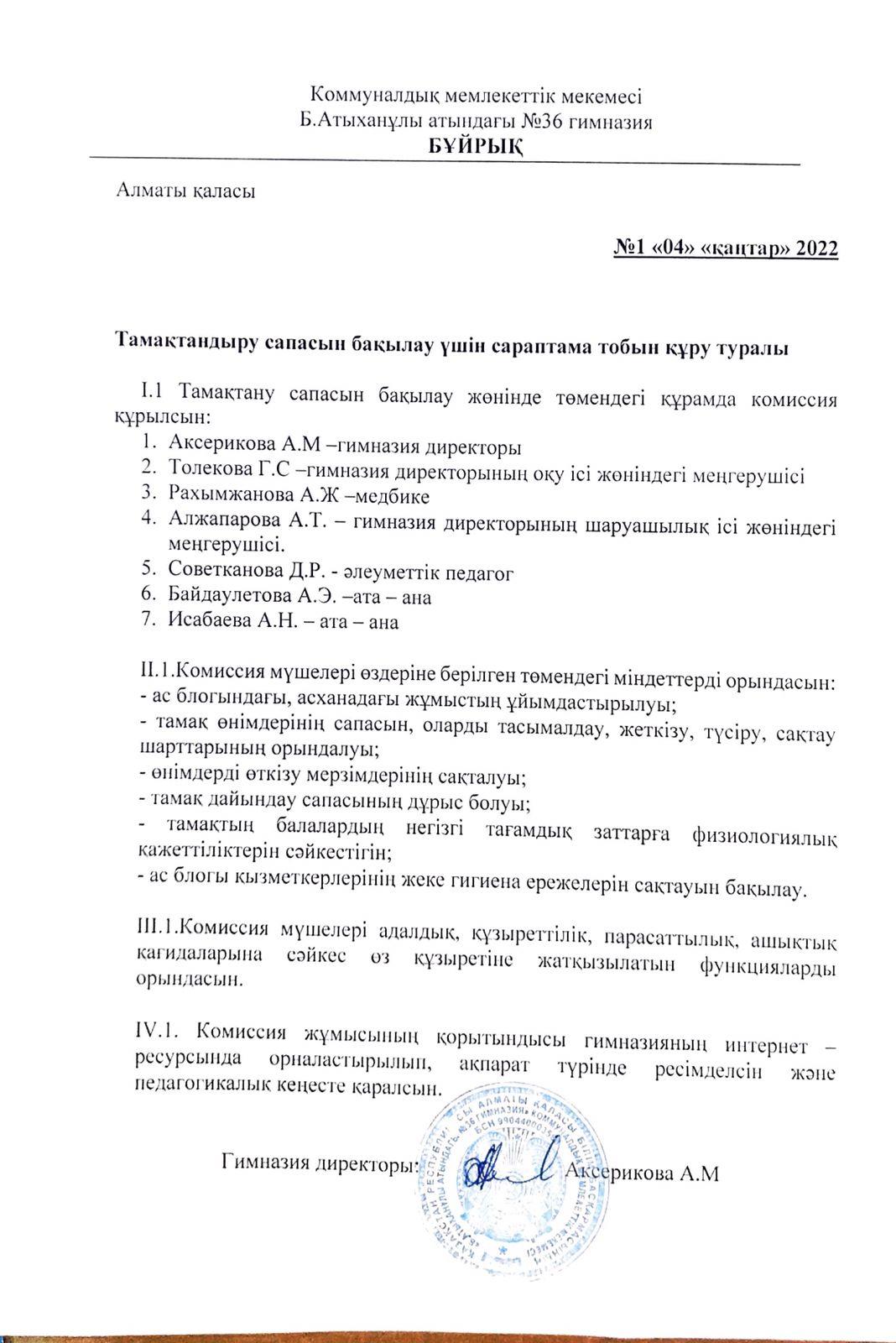 04 қаңтар 2022 0 1 2 3 4 5 Тамақтандыру сапасын бақылау үшін сараптама тобын құру туралы бұйрық Осы беттің QR-коды:QR-код этой страницы: